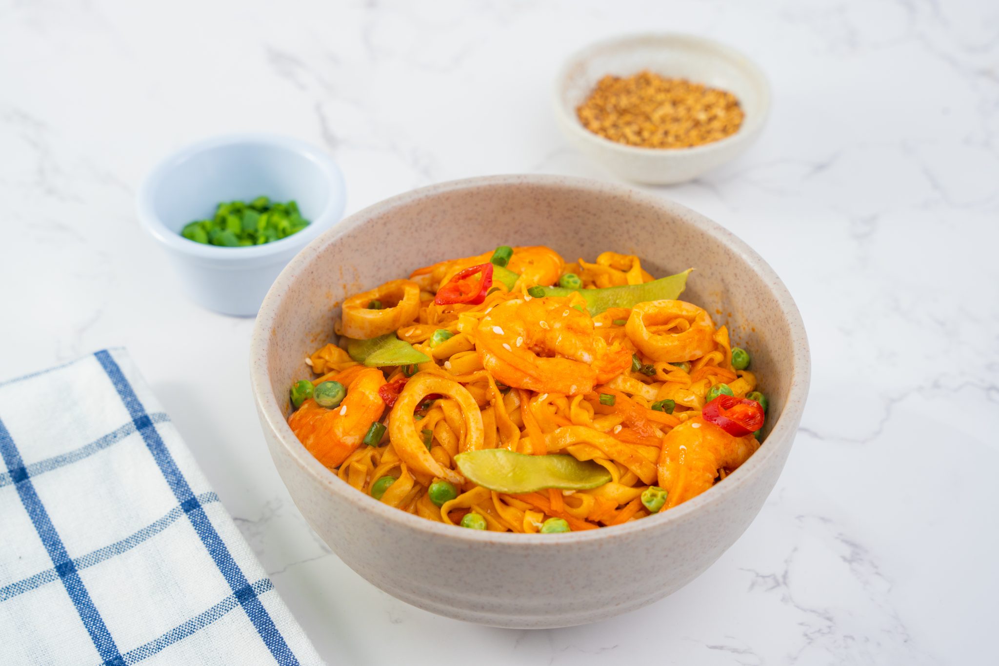 スキスキうどんのやわらかいうどんを、エビやイカ、シャキシャキの野菜と一緒に炒めて、日本風の濃厚なソースで仕上げました。約15分で簡単に作れるレシピなので、忙しい日にもぴったり。しっかりとした栄養と旨味が楽しめます。