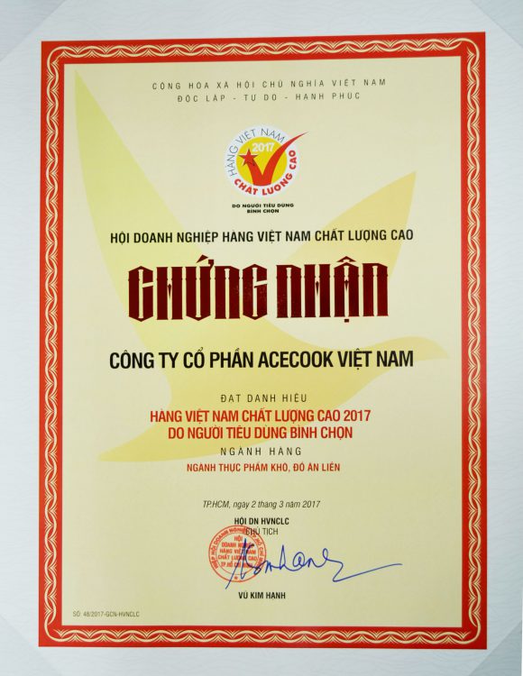 Tối 03/03/2017 tại Trung tâm hội nghị White Palace Tp.HCM, Công ty CP Acecook Việt Nam vinh dự nhận danh hiệu Hàng Việt