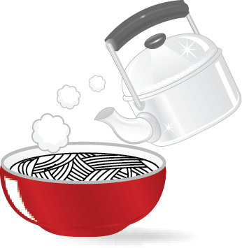 Cho vắt bún vào tô thứ nhất, chế nước sôi vào khoảng 500ml, đậy nắp lại và chờ 5 phút. Mở nắp ra, đảo đều, chắt ráo nước.