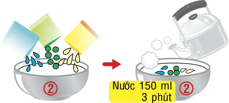 Chuẩn bị tô nước chấm: Cho gói súp bột, gói dầu và gói rau vào tô thứ hai, chế nước sôi vào khoảng 150ml, đậy nắp lại và chờ 3 phút.
