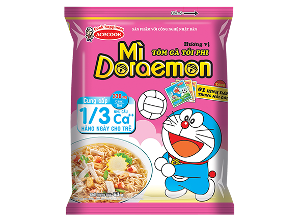 Mì Doraemon hương vị TÔM GÀ TỎI PHI không chỉ ngon, thân thiện với trẻ, từ nay sử dụng mì Doraemon với sợi mì được bổ sung canxi kết hợp với thể thao vận động phù hợp với trẻ sẽ thúc đẩy tăng trưởng chiều cao một cách hiệu quả. Bộ sticker sẽ đi theo chủ đề các môn thể thao và với sự góp mặt của nhân vật Doraemon sẽ tạo hứng thú cho bé và tạo sự thiện cảm của các bậc bố mẹ đối với nhãn hàng.