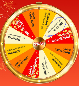 Bước 3: Khách hàng nhấn “Quay thưởng” và được hệ thống sẽ xác định trúng thưởng ngẫu nhiên qua vòng quay. Vòng quay bao gồm 12 phần, ghi nhận 03 Giải I (Nhất), 03 Giải II (Nhì), 03 Giải Khuyến khích và 03 Cơ hội trúng Giải May mắn phút chót xen kẽ lẫn nhau với cách thức như hình ảnh bên dưới: