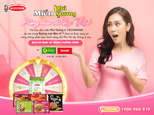 Để tri ân sự tin dùng của người tiêu dùng, ngày 01 tháng 03 năm 2019, công ty Acecook Việt Nam chính thức mang đến mọi người một chương trình khuyến mại dành cho tất cả những người đang yêu mến các sản phẩm Miến Phú Hương Yến Tiệc, Miến ăn liền miến xào Phú Hương, Miến ăn liền miến trộn Phú Hương, Miến ăn liền Phú Hương.