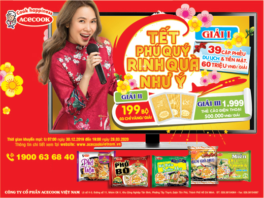 16.12.2019 Khuyến Mãi Thể Lệ Và Danh Sách Trúng Thưởng CTKM “TẾT PHÚ QUÝ RINH QUÀ NHƯ Ý”Để đáp lại sự tin yêu của người tiêu dùng Việt trên toàn quốc, từ ngày 30 tháng 12 năm 2019 Công ty cổ phần Acecook Việt