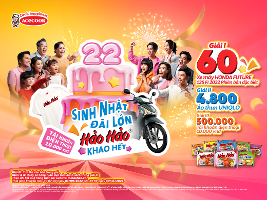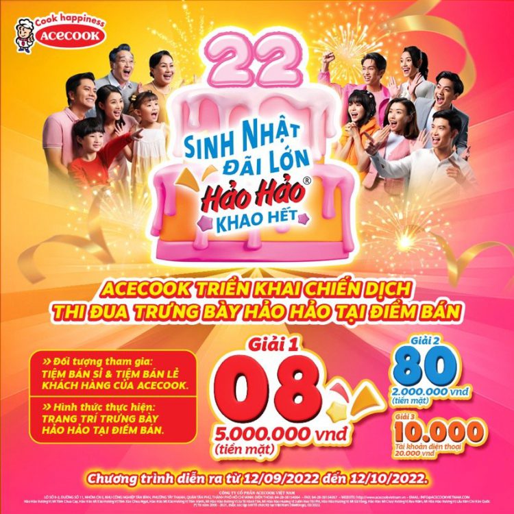 03.10.2022 Khuyến Mãi DANH SÁCH TRÚNG THƯỞNG CTKM SINH NHẬT ĐÃI LỚN HẢO HẢO KHAO HẾTĐể tri ân sự tin dùng của người tiêu dùng, ngày 01 tháng 09 năm 2022, công ty Acecook Việt Nam chính thức mang đến mọi