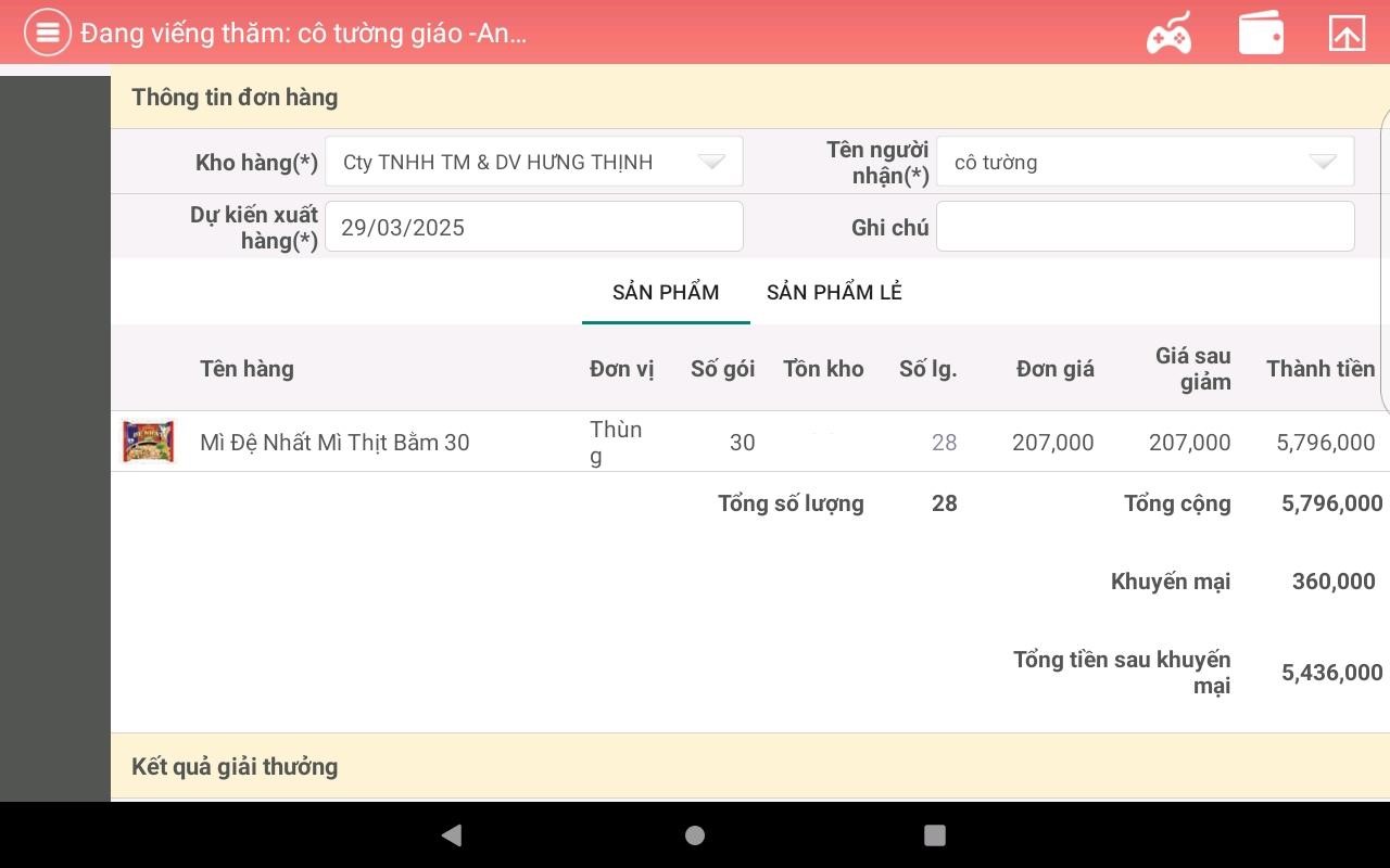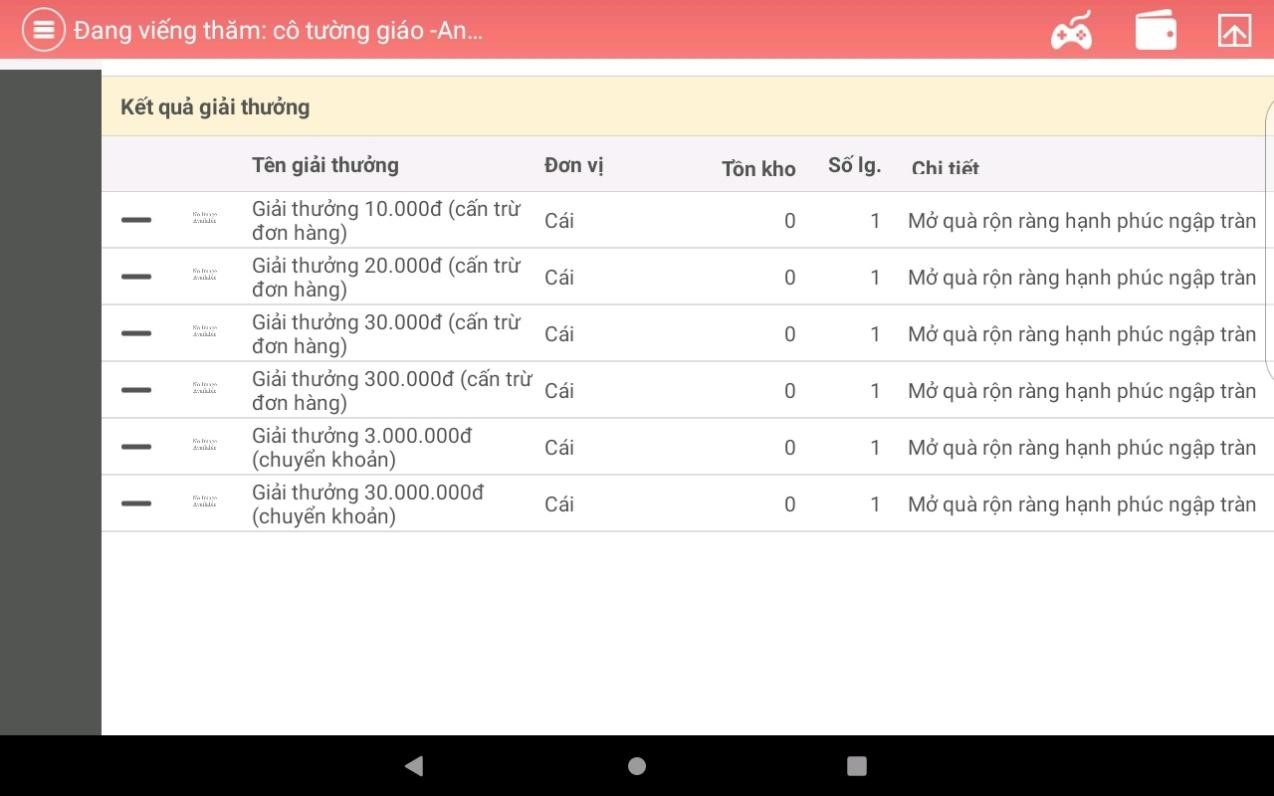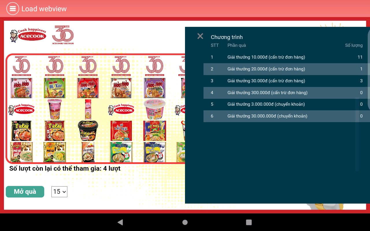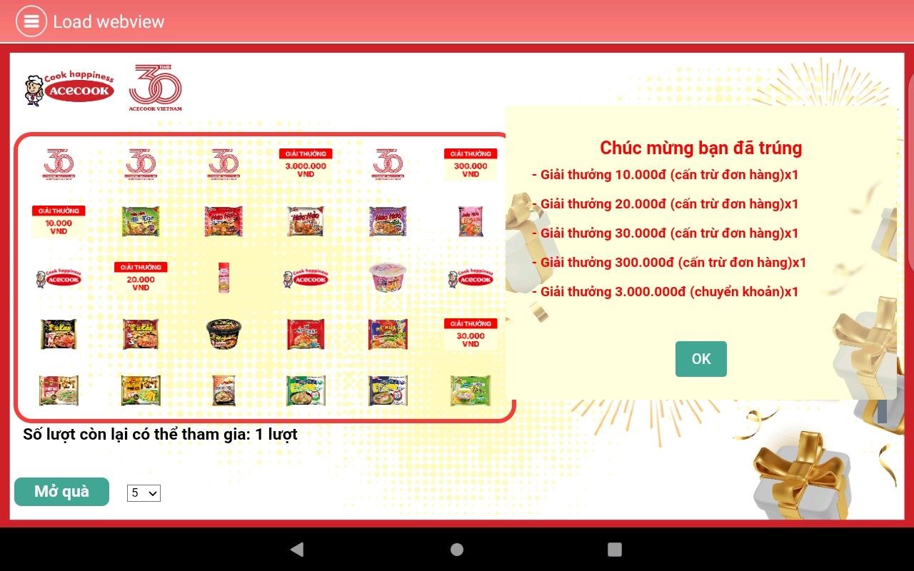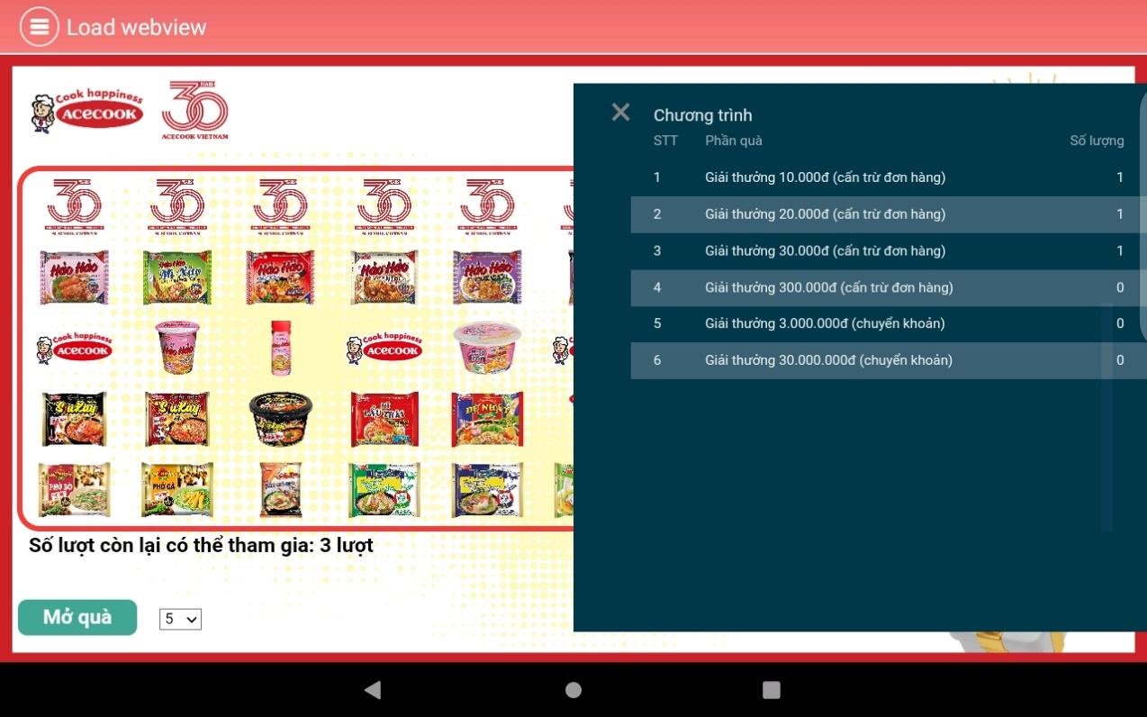 Sau mỗi lần Mở Quà và hoàn tất các lần Mở Quà trên hệ thống, Nhân viên bán hàng của Công ty Cổ phần Acecook Việt Nam sẽ cho khách hàng xem thông tin giá trị và số lượng từng loại giải thưởng.