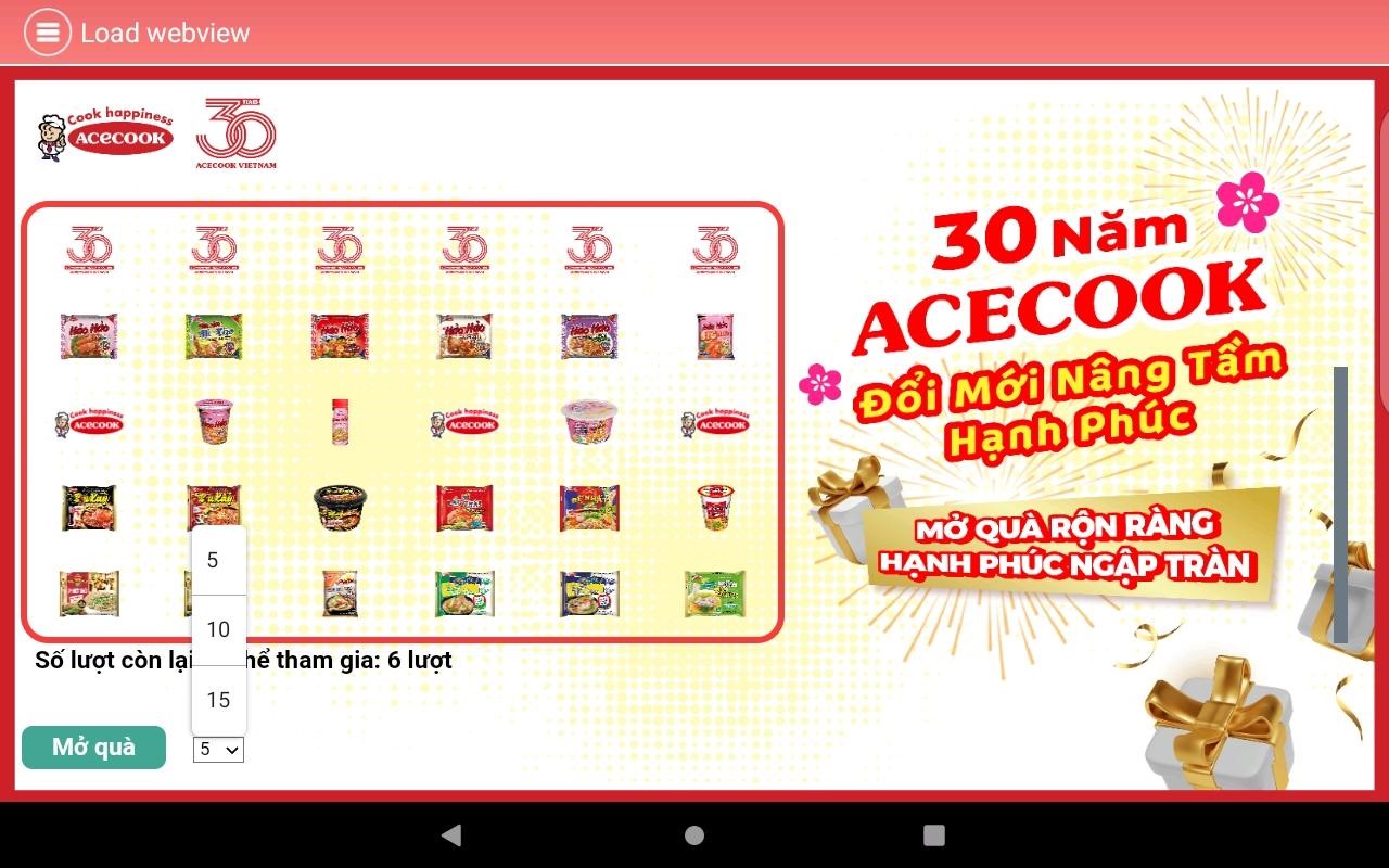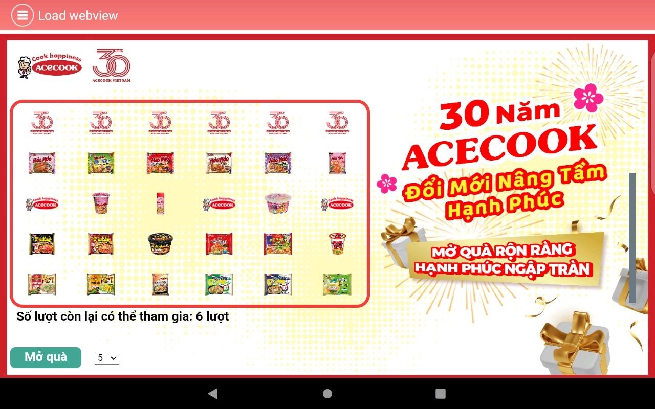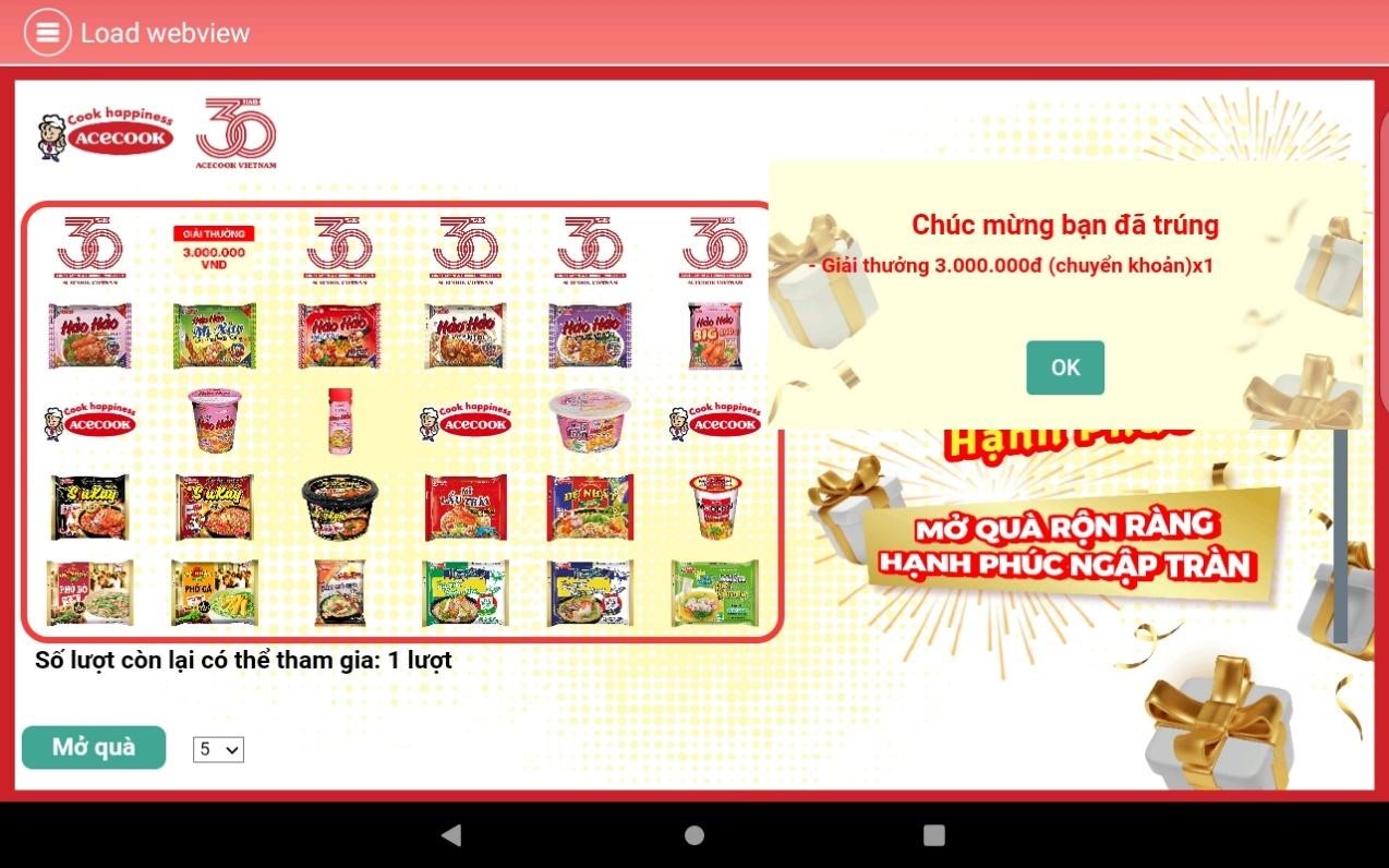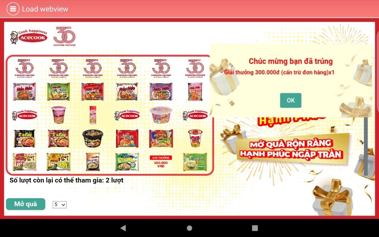 Màn hình hiển thị 30 logo sản phẩm và logo Acecook tương ứng với 30 ô quà tặng, khách hàng chọn một trong hai cách “Mở quà”: