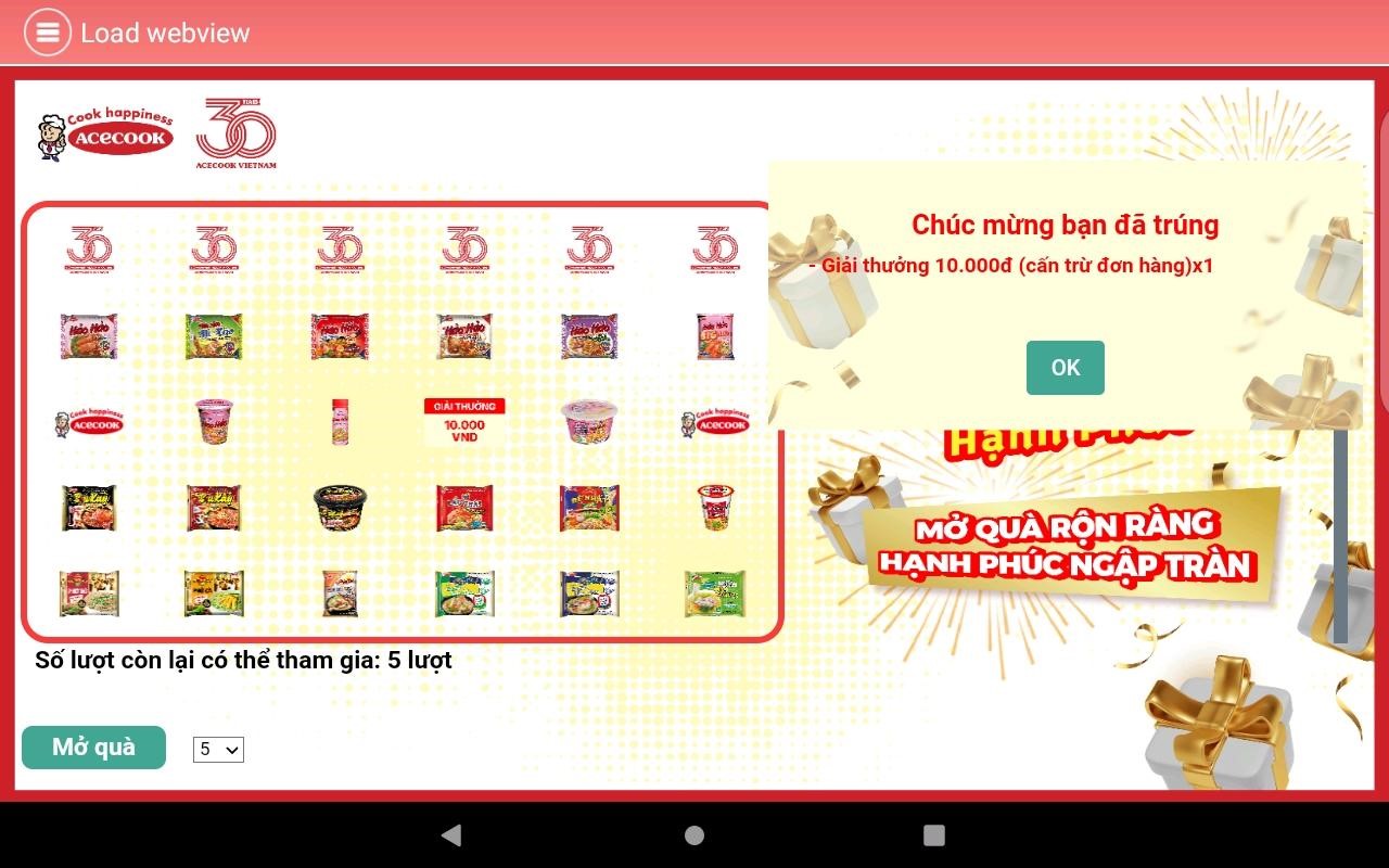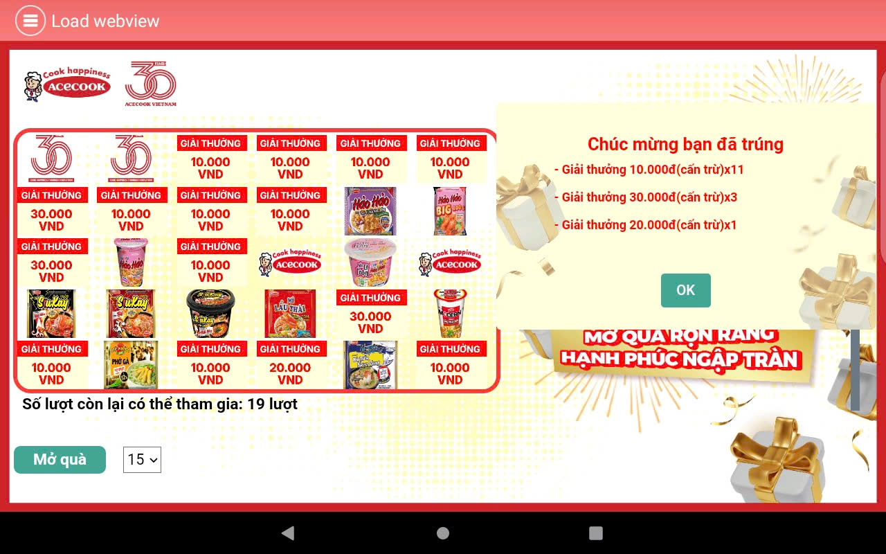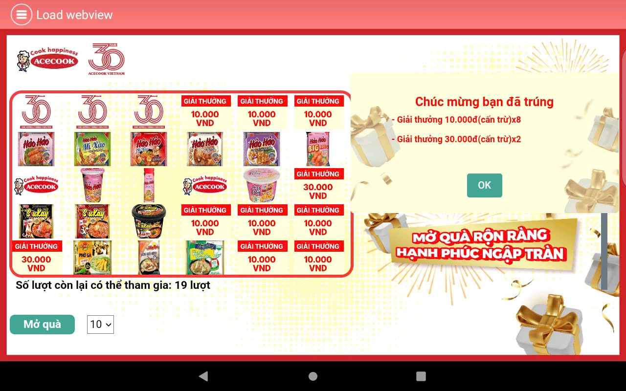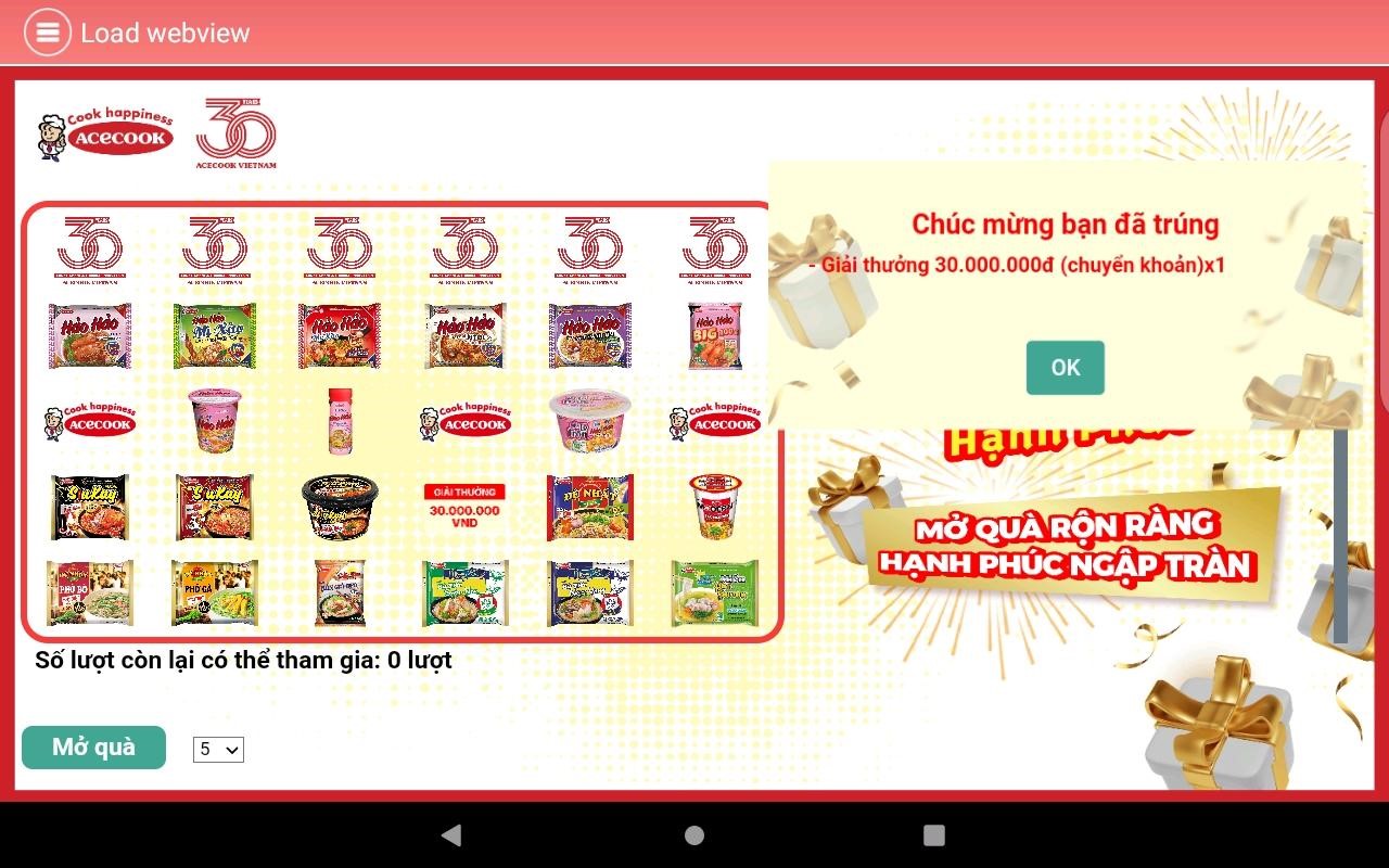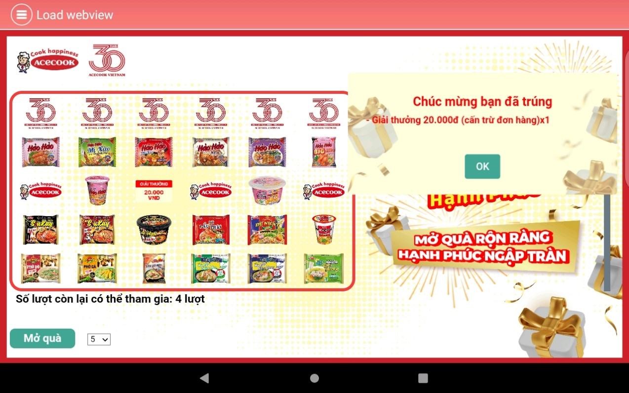 Màn hình hiển thị 30 logo sản phẩm và logo Acecook tương ứng với 30 ô quà tặng, khách hàng chọn một trong hai cách “Mở quà”: