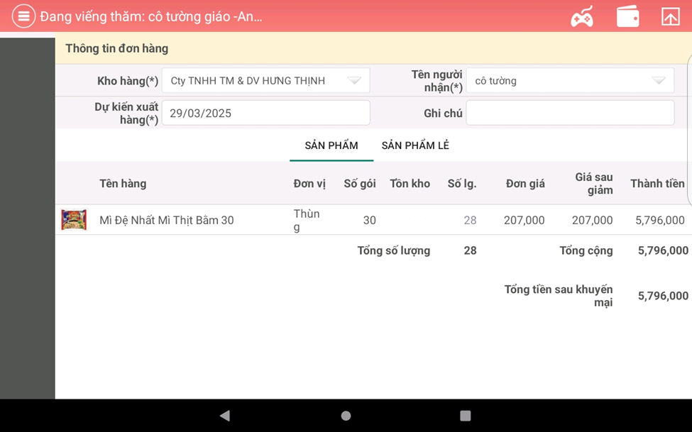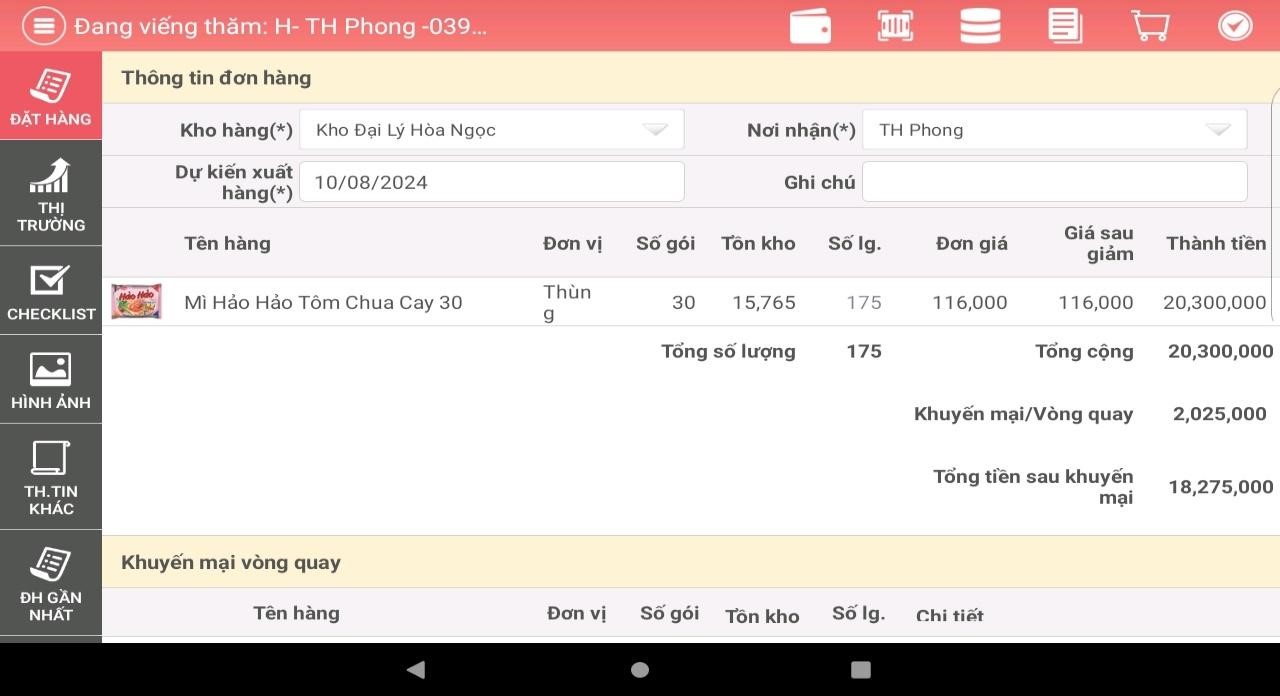 + Nhân viên bán hàng đến trực tiếp các điểm bán của khách hàng để giới thiệu về chương trình khuyến mại và hỗ trợ khách hàng điền thông tin đặt hàng (thông tin đặt hàng gồm các thông tin như: mã số khách hàng, tên và số lượng sản phẩm đặt mua) lên ứng dụng bán hàng “Smartsales” của Công ty Cổ phần Acecook Việt Nam (“Hệ thống”). Sau khi hoàn tất việc nhập thông tin, nhân viên bán hàng chọn “✅” để chuyển qua màn hình xác nhận đơn hàng trong vòng 02 (hai) phút kể từ thời điểm hoàn tất việc nhập thông tin đơn hàng của khách hàng.