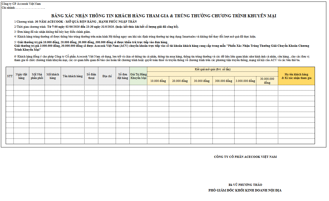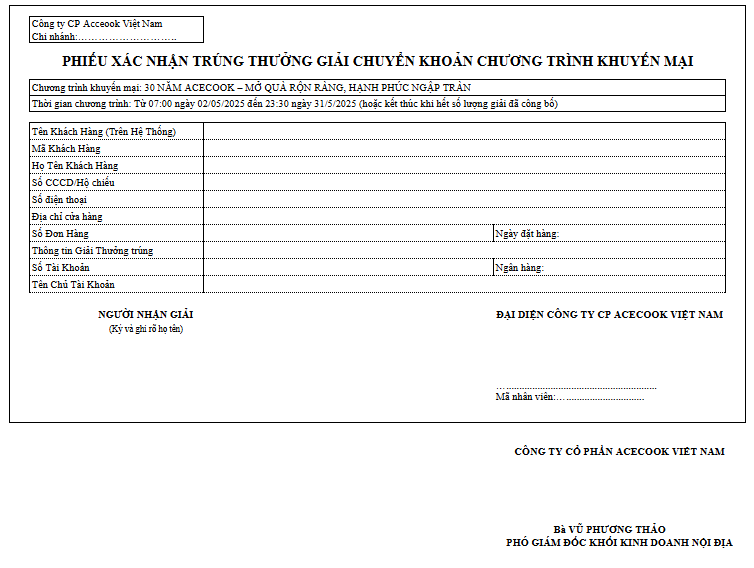 Ngoài ra khách hàng cần phải cung cấp được chính xác thông tin cá nhân, thông tin đơn hàng đã mua theo “PHIẾU XÁC NHẬN TRÚNG THƯỞNG GIẢI CHUYỂN KHOẢN CHƯƠNG TRÌNH KHUYẾN MẠI” để Công ty Cổ Phần Acecook Việt Nam có thể tiến hành trả thưởng thông qua hình thức chuyển khoản trực tiếp vào số tài khoản mà khách hàng đã cung cấp theo mẫu bên dưới.
