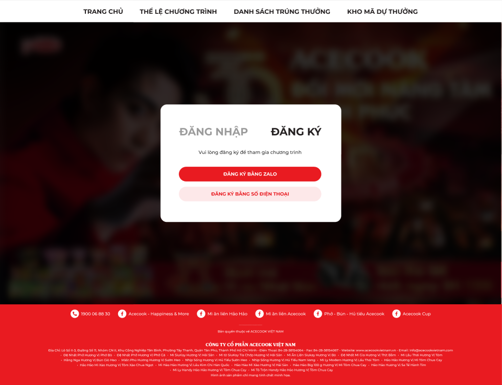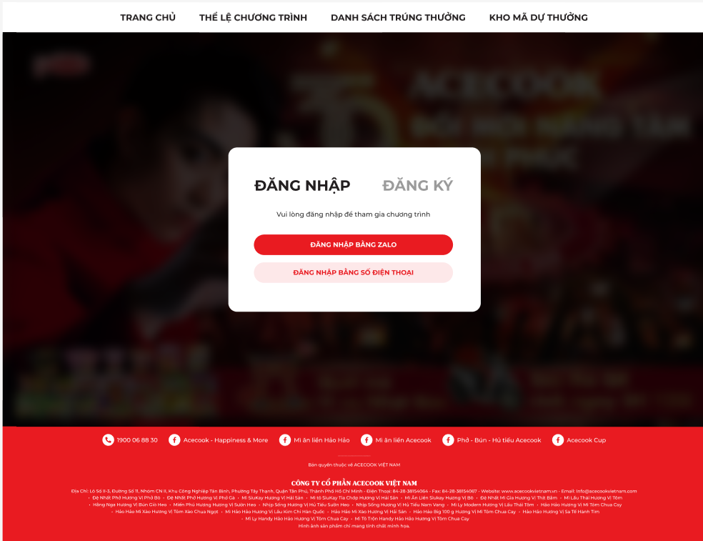 d. Địa điểm xác định trúng thưởng: Văn phòng Công ty Cổ phần Acecook Việt Nam, Lô số II-3, Đường số 11, Nhóm CN II, Khu Công Nghiệp Tân Bình, Phường Tây Thạnh, Quận Tân Phú, Thành phố Hồ Chí Minh dựa vào kết quả thống kê tại website “https://khuyenmai30nam.acecookvietnam.vn” và Zalo Mini App “Acecook Việt Nam”