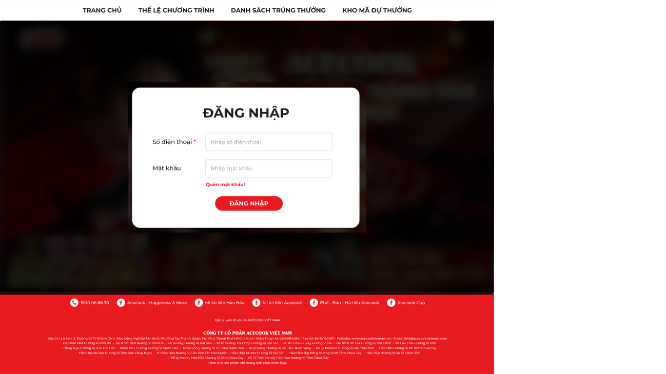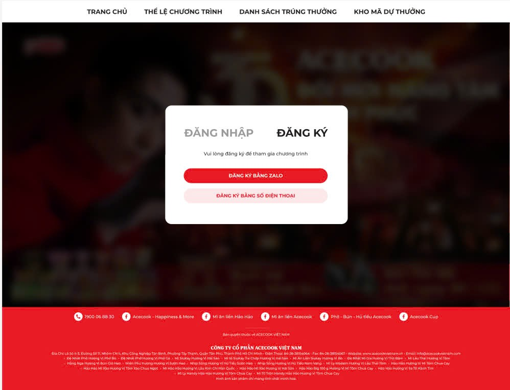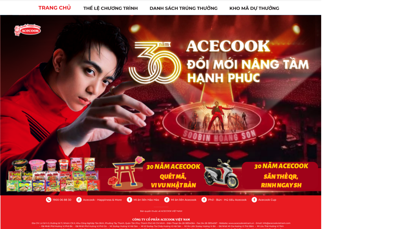 – Công ty Cổ phần Acecook Việt Nam thông báo công khai chi tiết nội dung của Thể lệ chương trình khuyến mại trên website “https://khuyenmai30nam.acecookvietnam.vn”, Zalo Mini App “Acecook Việt Nam” và tại các đại lý, nhà phân phối hàng hóa khuyến mại trên toàn quốc.