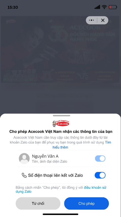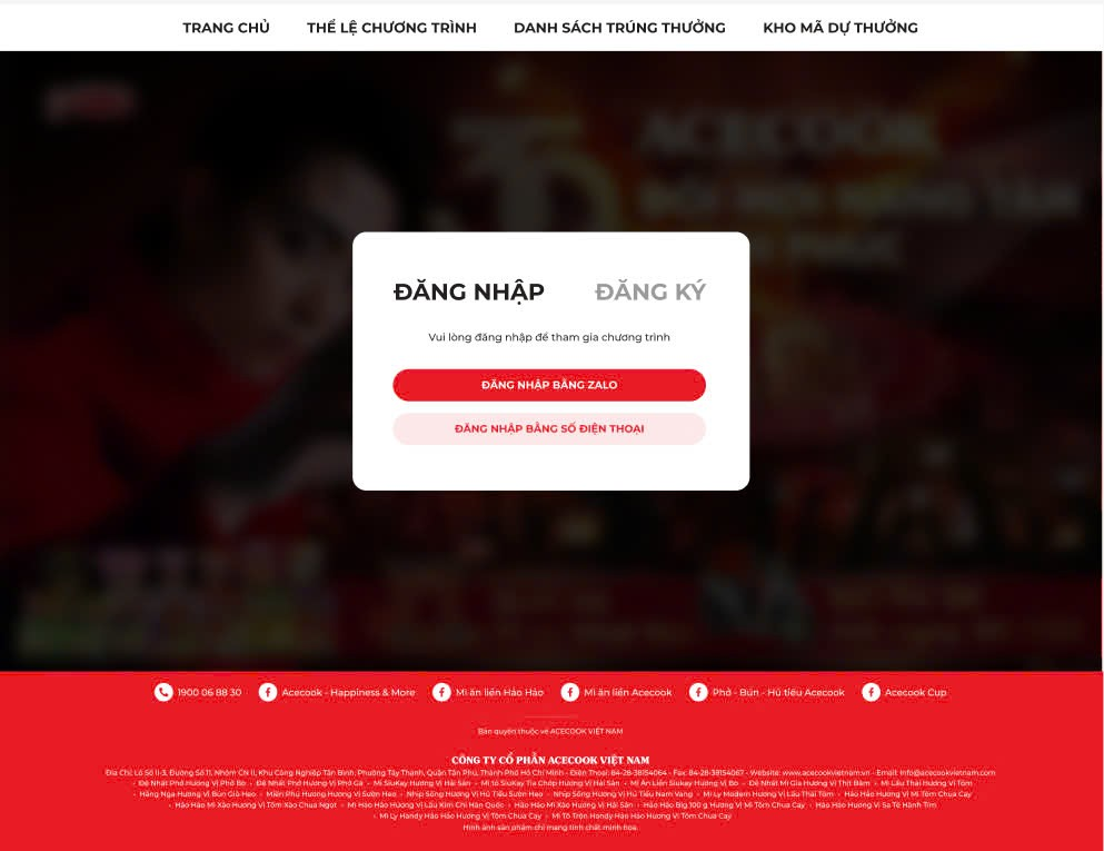 i. Trường hợp khách hàng đã đăng ký hoặc đăng nhập Tài Khoản Khách Hàng trên thiết bị hoặc tài khoản Zalo được đăng nhập trên ứng dụng Zalo đã được khách hàng liên kết với Tài Khoản Khách Hàng thành công trước đó: hệ thống ngay lập tức hiển thị màn hình Kho Mã Dự Thưởng. Khách hàng chọn “30 NĂM ACECOOK SĂN THẺ QR, RINH NGAY SH” để kiểm tra mã kiểm soát trong chương trình khuyến mại này.