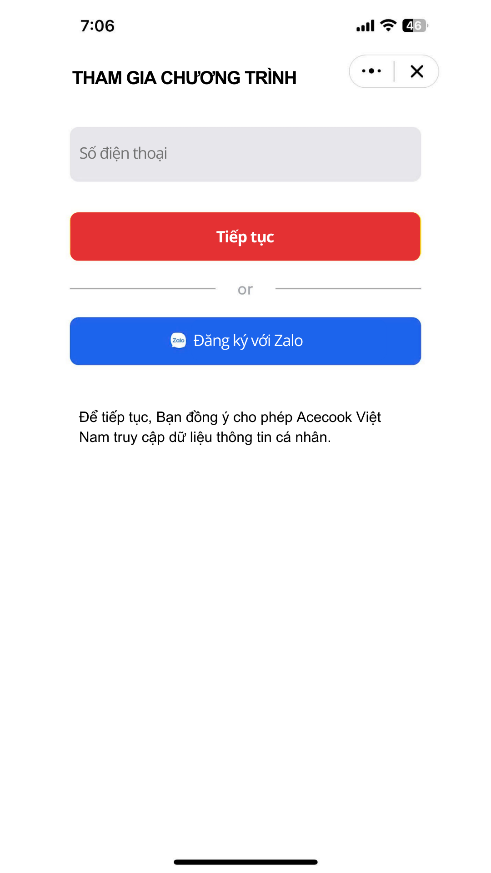 i. Bước 1: Khách hàng bấm vào ô “THAM GIA KHẢO SÁT” được hiển thị trên màn hình Zalo Mini App “Acecook Việt Nam” sau khi khách hàng quét mã QR hợp lệ theo Cách 2 Mục 8.4.3 và nhận được thông báo theo Mục 8.4.4 Thể lệ. Hệ thống hiển thị màn hình ngay lập tức để khách hàng tham gia khảo sát.