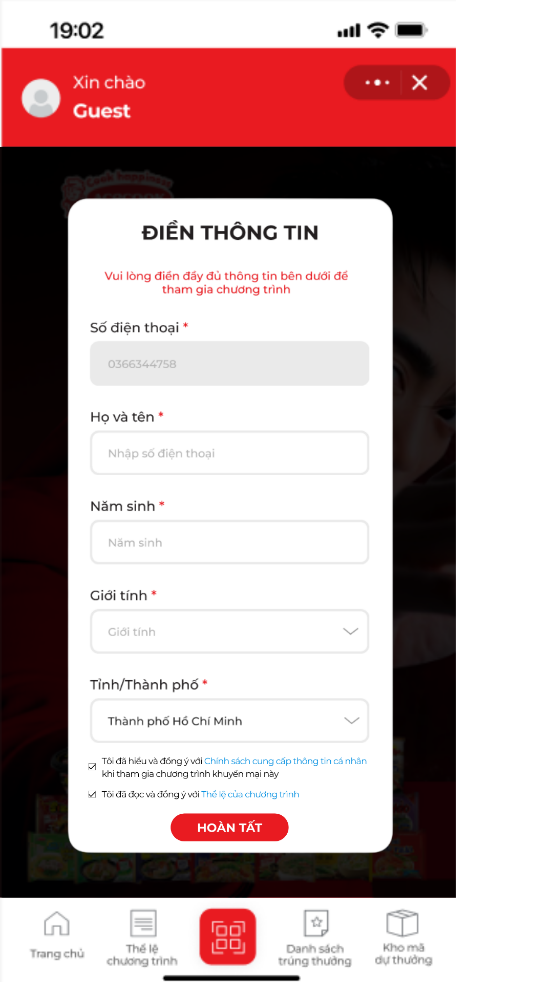 a. Khách hàng quét Mã QR hợp lệ theo 01 trong 02 cách quy định tại Mục 8.4.3 Thể lệ và hệ thống kiểm tra Mã QR chưa được sử dụng thì hệ thống ngay lập tức ghi nhận mã kiểm soát được mã hóa và thể hiện trong Mã QR của thẻ QR mà khách hàng vừa quét vào Kho Mã Dự Thưởng của Tài Khoản Khách Hàng.