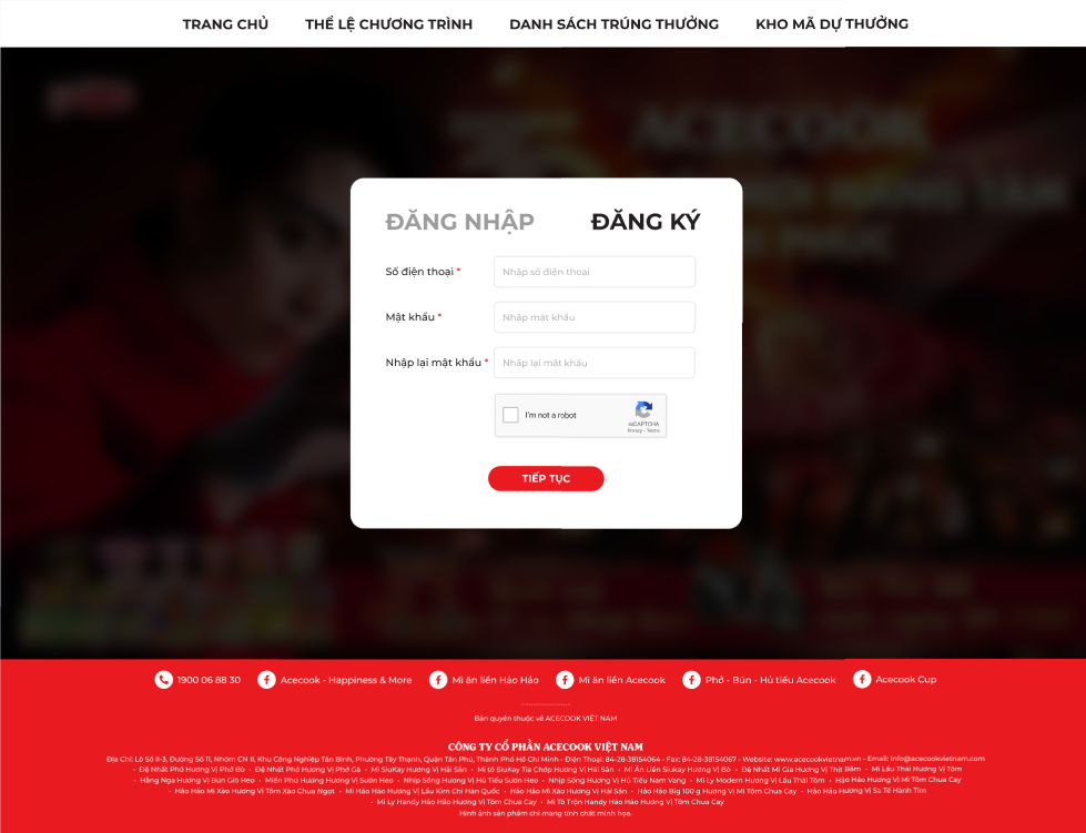 – Hệ thống ngay lập tức hiển thị màn hình để khách hàng điền thông tin đăng ký tham gia chương trình với các thông tin bắt buộc gồm: số điện thoại (số điện thoại phải đủ 10 số và bắt đầu bằng số “0”), mật khẩu và nhập lại mật khẩu. Sau đó, khách hàng bấm chọn ô “I’m not a robot” (để xác thực người dùng) và bấm “TIẾP TỤC” để hệ thống ghi nhận thông tin tham gia của khách hàng.