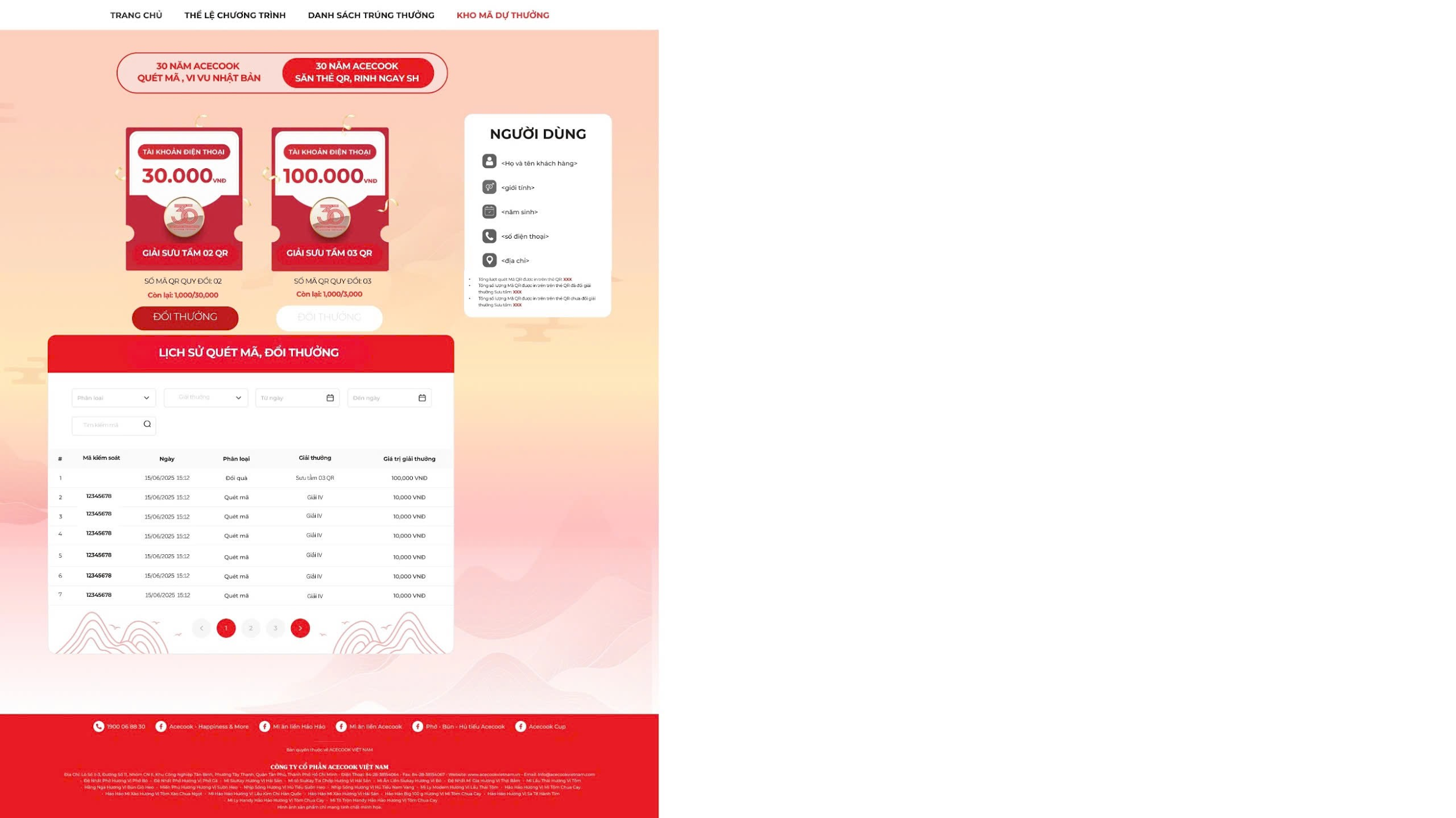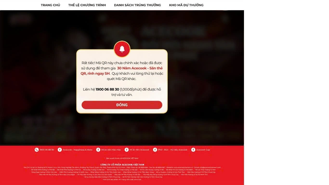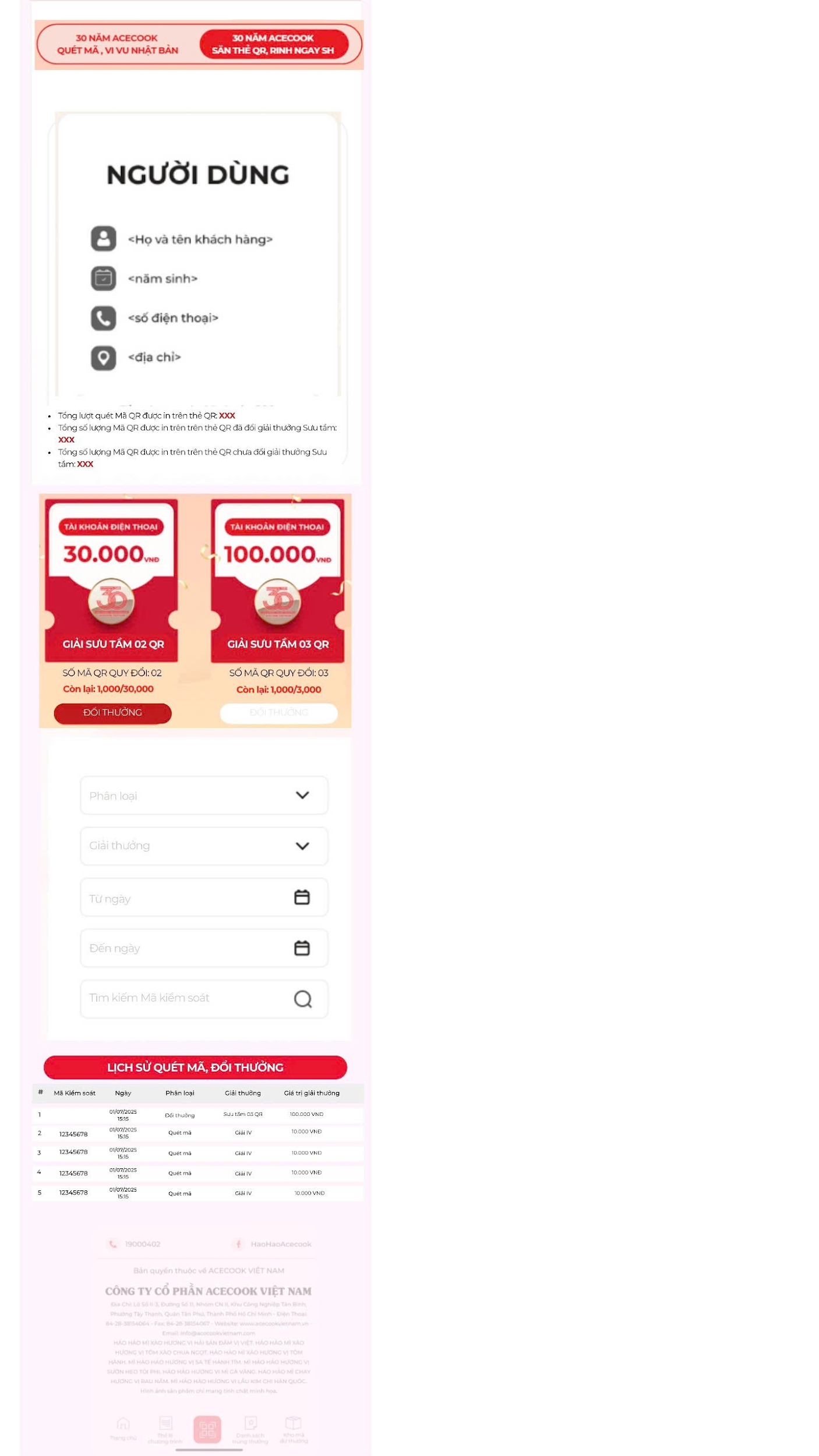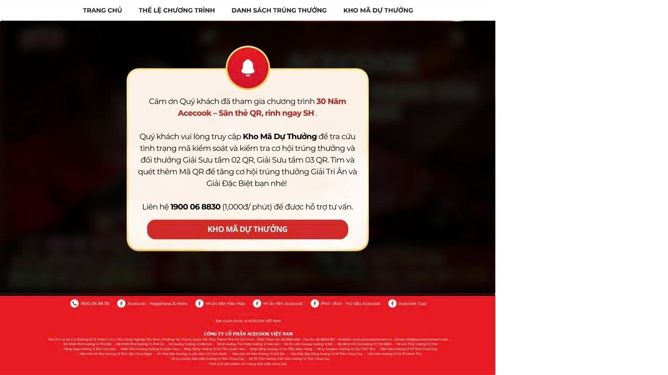 Sau khi thực hiện đăng ký/ đăng nhập Tài Khoản Khách Hàng thành công, hệ thống ngay lập tức hiển thị màn hình Kho Mã Dự Thưởng. Khách hàng chọn “30 NĂM ACECOOK SĂN THẺ QR, RINH NGAY SH” để kiểm tra mã kiểm soát của thẻ QR được mã hóa và thể hiện trong Mã QR đã được quét trong chương trình khuyến mại này.