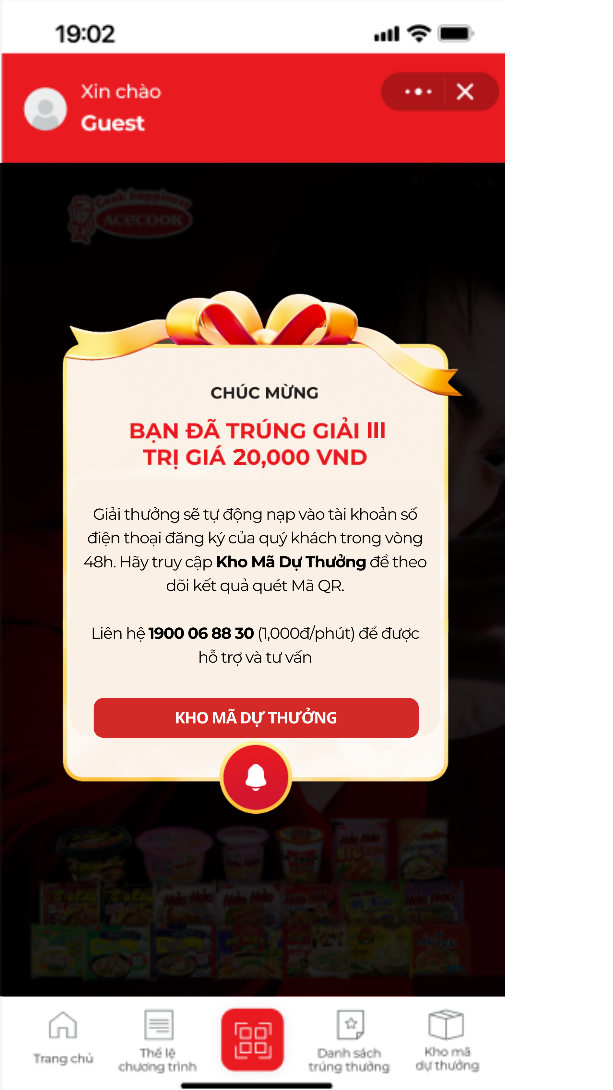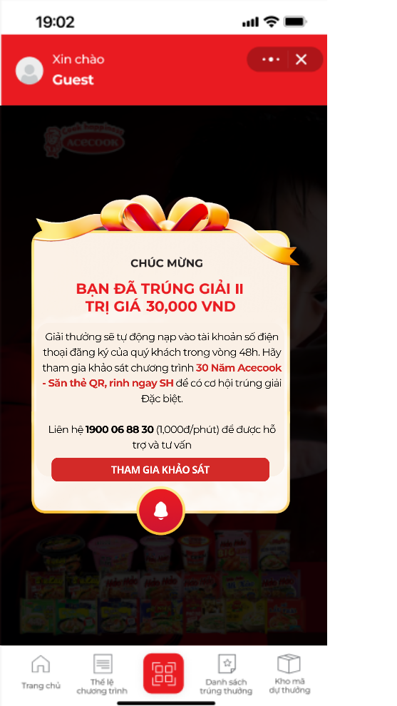 a. Trường hợp khách hàng đã đăng ký hoặc đăng nhập Tài Khoản Khách Hàng trên thiết bị trước đó, hệ thống ngay lập tức hiển thị màn hình Kho Mã Dự Thưởng. Khách hàng chọn “30 NĂM ACECOOK SĂN THẺ QR, RINH NGAY SH” để kiểm tra mã kiểm soát của thẻ QR được mã hóa và thể hiện trong Mã QR đã được quét trong chương trình khuyến mại này.