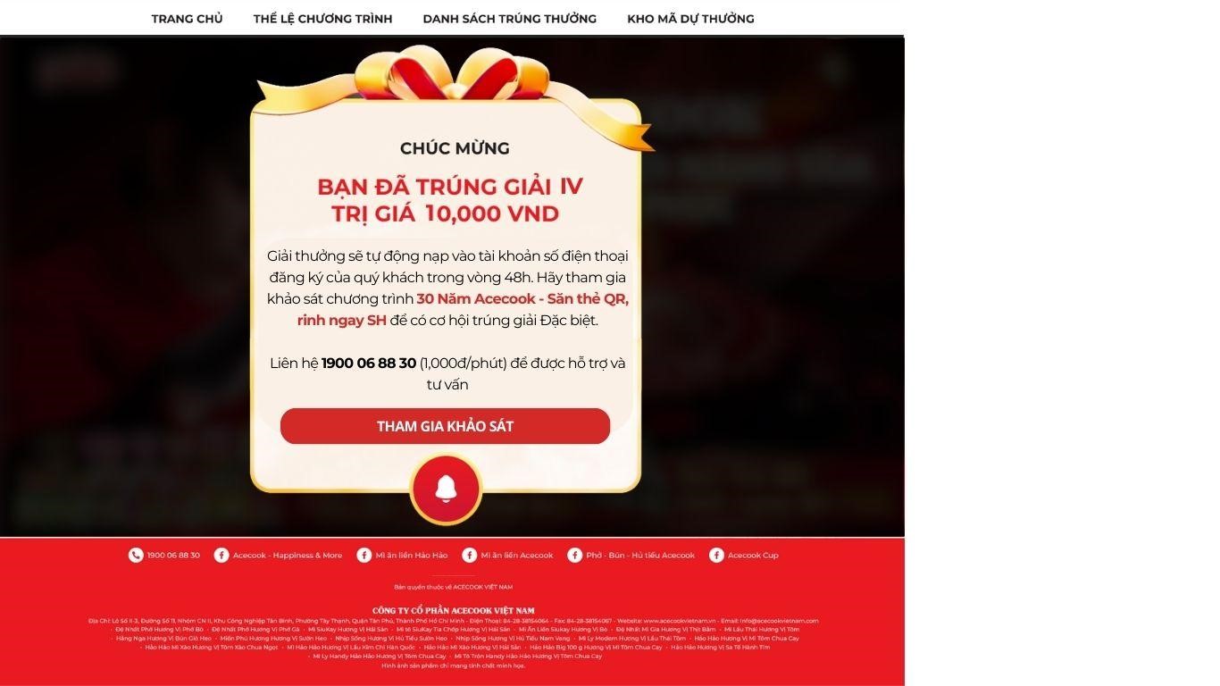 v. Khách hàng có thể theo dõi kết quả xác định trúng thưởng đối với Giải Đặc Biệt trên website “https://khuyenmai30nam.acecookvietnam.vn” và Zalo Mini App “Acecook Việt Nam”.