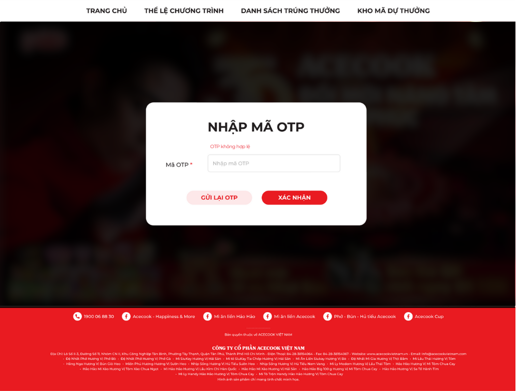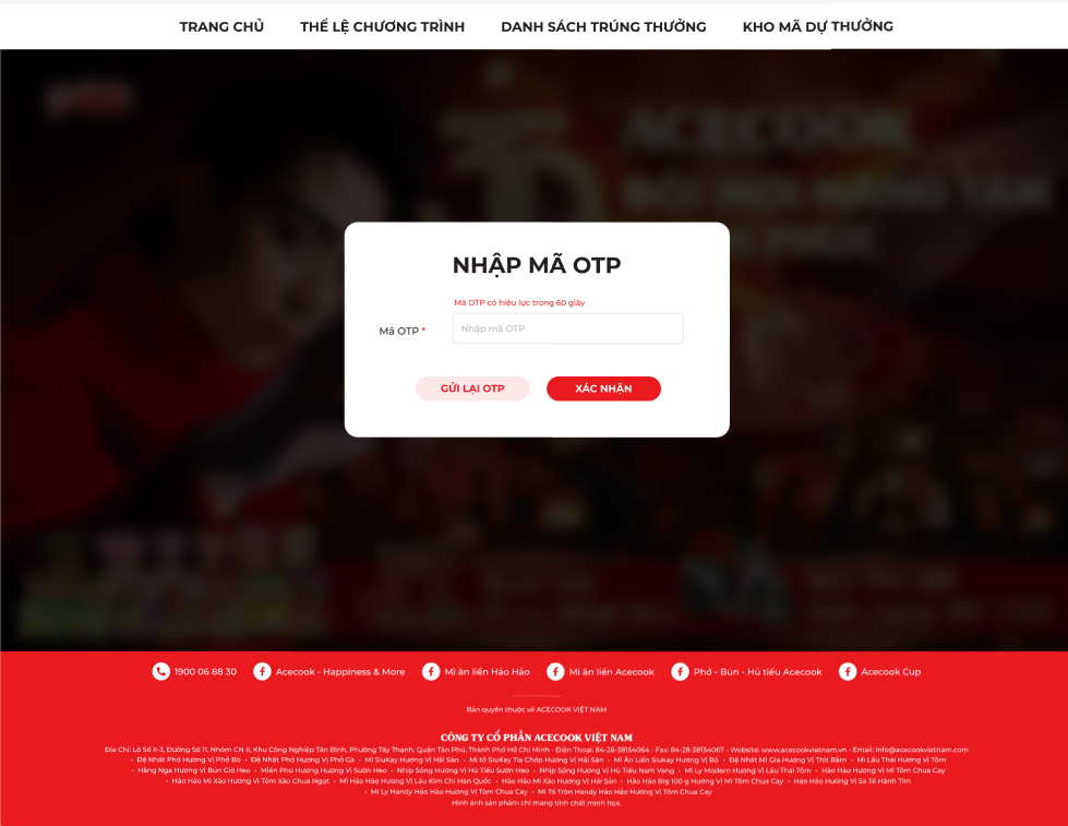 b. Trong vòng 05 ngày kể từ ngày tổng đài 02888803030 liên hệ thành công để thông báo trúng thưởng và ghi nhận thông tin của khách hàng, tổng đài tin nhắn Acecook VN sẽ nhắn tin thông báo trúng thưởng đến Số Điện Thoại Khách Hàng với nội dung: