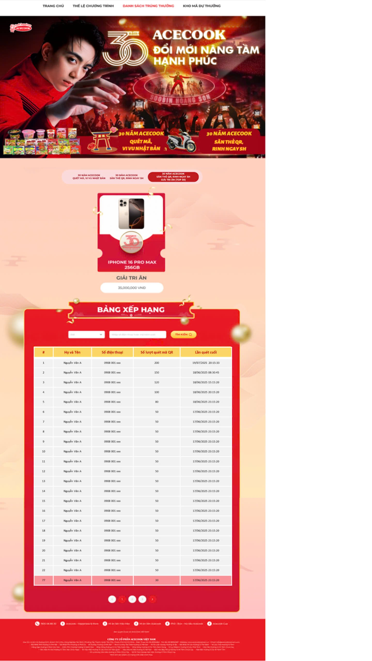 e. Công ty Cổ phần Acecook Việt Nam liên tục đồng bộ, cập nhật và công bố danh sách 30 khách hàng với Tài Khoản Khách Hàng được hệ thống ghi nhận quét Mã QR hợp lệ theo thứ tự nhiều nhất và sớm nhất trên website “https://khuyenmai30nam.acecookvietnam.vn” và Zalo Mini App “Acecook Việt Nam”. Khách hàng có thể theo dõi danh sách xếp hạng tại mọi thời điểm và kết quả xác định trúng thưởng đối với Giải Tri Ân trên website “https://khuyenmai30nam.acecookvietnam.vn” và Zalo Mini App “Acecook Việt Nam”