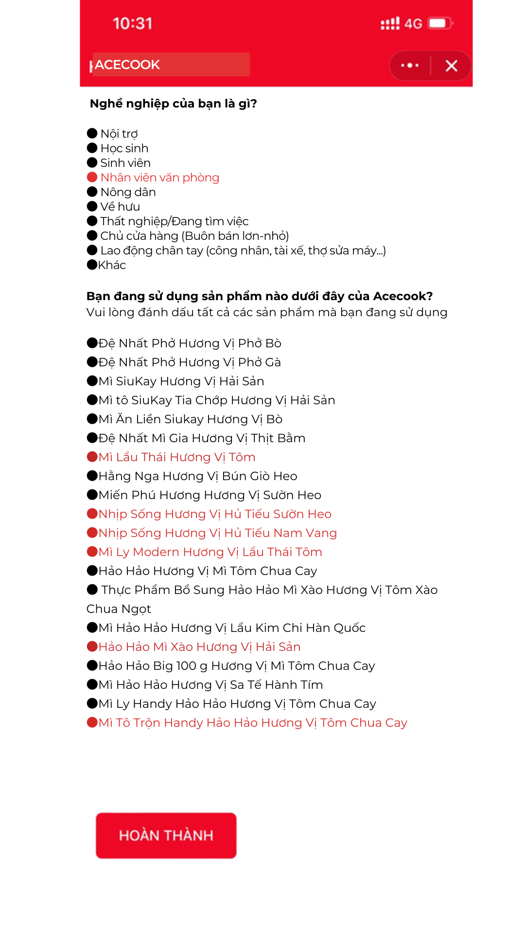 ii. Bước 2: Khách hàng tham gia khảo sát bằng cách trả lời tất cả các câu hỏi được hiển thị trên màn hình (Danh sách câu hỏi được đính kèm theo Thể lệ này). Sau khi trả lời tất cả các câu hỏi, khách hàng bấm vào ô “HOÀN THÀNH” để hoàn thành khảo sát.