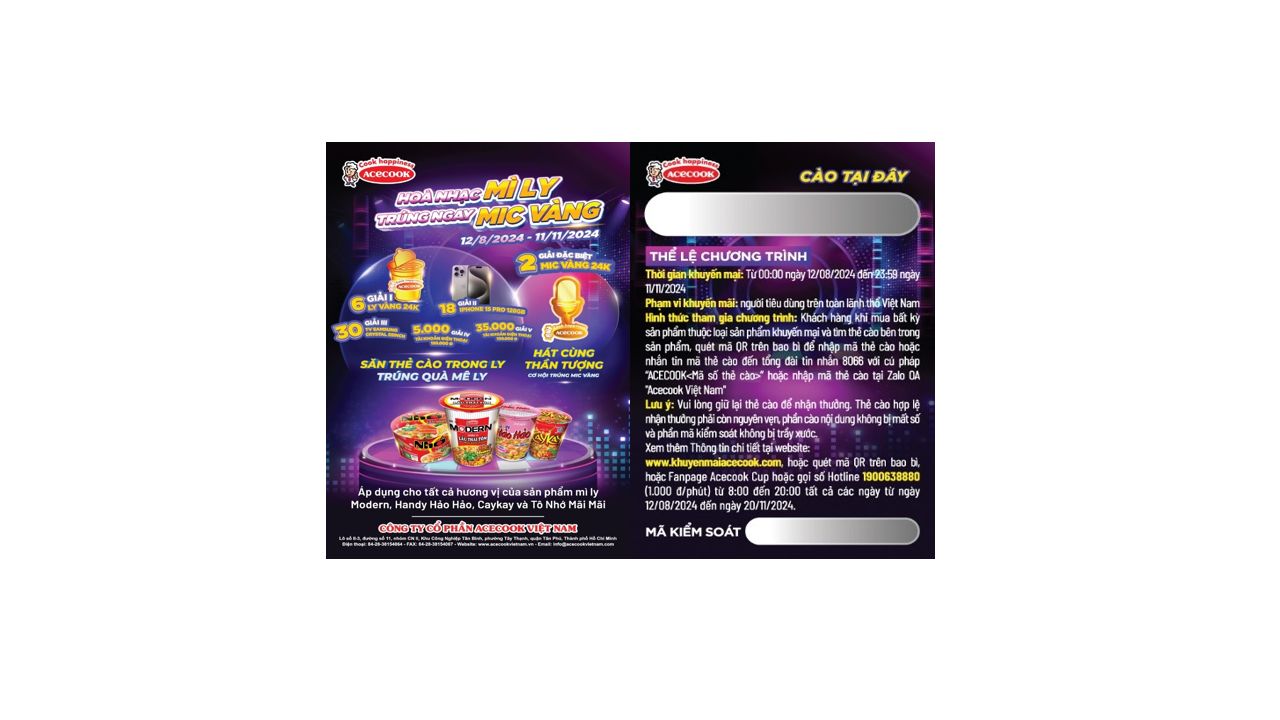 Công ty Cổ phần Acecook Việt Nam sẽ tiến hành đặt thẻ cào đã được để trong bao nhựa trong suốt và ngẫu nhiên đặt vào bên trong ly hoặc tô sản phẩm khuyến mại dưới sự chứng kiến của đại diện Sở Công Thương tại địa phương (nếu có), và sau đó phân bố số sản phẩm khuyến mại trên toàn quốc từ ngày 12/08/2024.