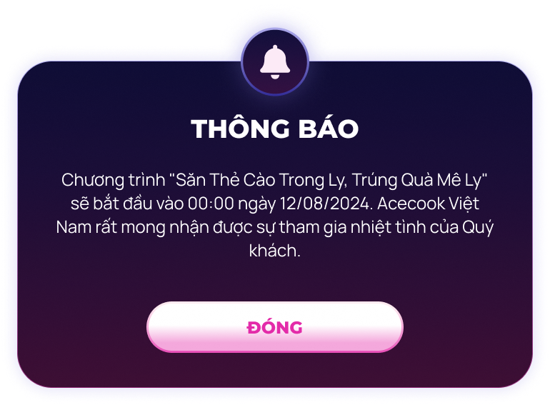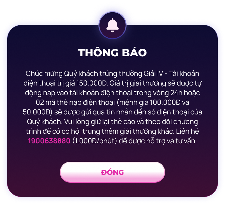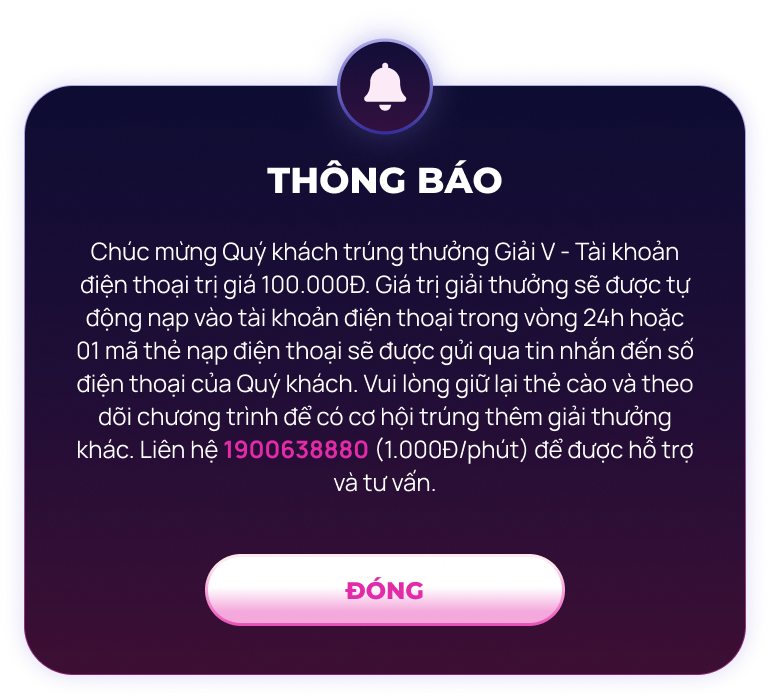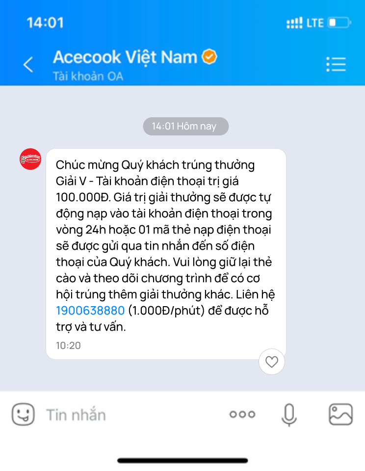 Trong vòng 24 giờ (trừ trường hợp bất khả kháng) kể từ khi khách hàng nhập mã thẻ cào, khách hàng sẽ nhận được thông báo trúng thưởng từ Zalo OA “Acecook Việt Nam” với nội dung: “Chúc mừng Quý khách trúng thưởng Giải V – Tài khoản điện thoại trị giá 100.000Đ. Giá trị giải thưởng sẽ được tự động nạp vào tài khoản điện thoại trong vòng 24h hoặc 01 mã thẻ nạp điện thoại sẽ được gửi qua tin nhắn đến số điện thoại của Quý khách. Vui lòng giữ lại thẻ cào và theo dõi chương trình để có cơ hội trúng thêm giải thưởng khác. Liên hệ 1900638880 (1.000Đ/phút) để được hỗ trợ và tư vấn.”