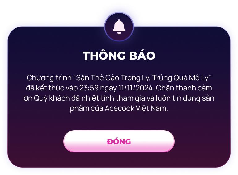 - Trường hợp mã thẻ cào hợp lệ (mã thuộc Danh Sách Mã Thẻ Cào) nhưng không thuộc 35.000 mã thẻ cào đầu tiên tham gia Chương Trình hợp lệ: trong vòng 24 giờ (trừ trường hợp bất khả kháng) kể từ khi khách hàng nhập mã thẻ cào, khách hàng sẽ nhận được thông báo từ Zalo OA “Acecook Việt Nam” với nội dung: “Quý khách đã nhập mã thẻ cào thành công. Rất tiếc, hiện tại Giải V – Tài khoản điện thoại trị giá 100.000Đ đã hết. Vui lòng giữ lại thẻ cào và truy cập website www.khuyenmaiacecook.com để tiếp tục tham gia và có cơ hội nhận giải IV – Tài khoản điện thoại 150.000Đ và các giải thưởng hấp dẫn khác. Liên hệ 1900638880 (1.000Đ/phút) để được hỗ trợ và tư vấn.”.