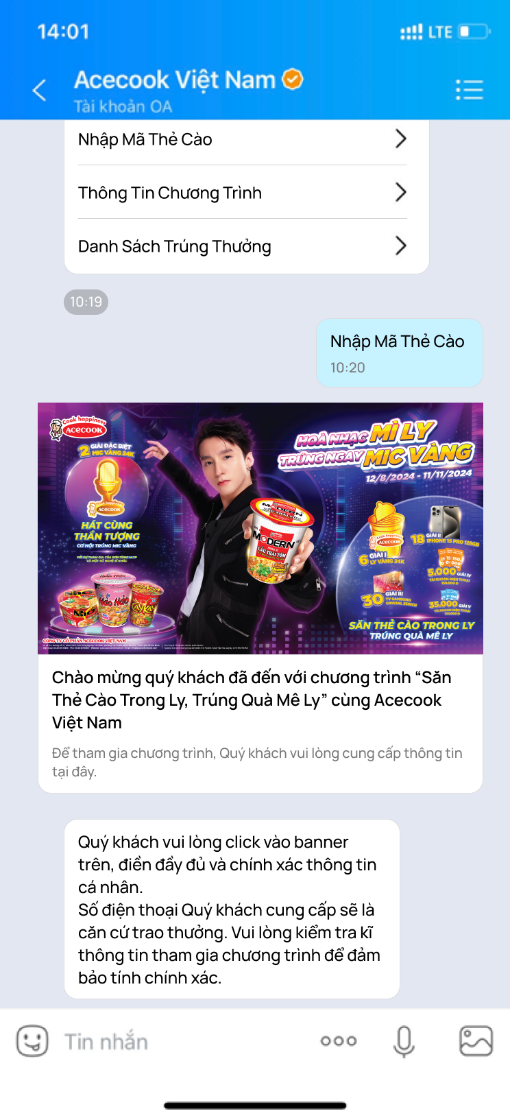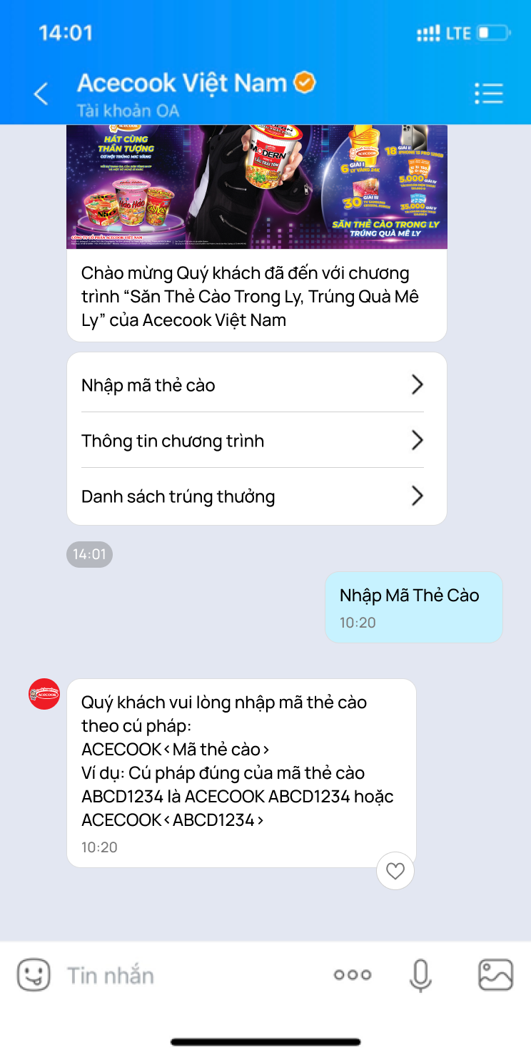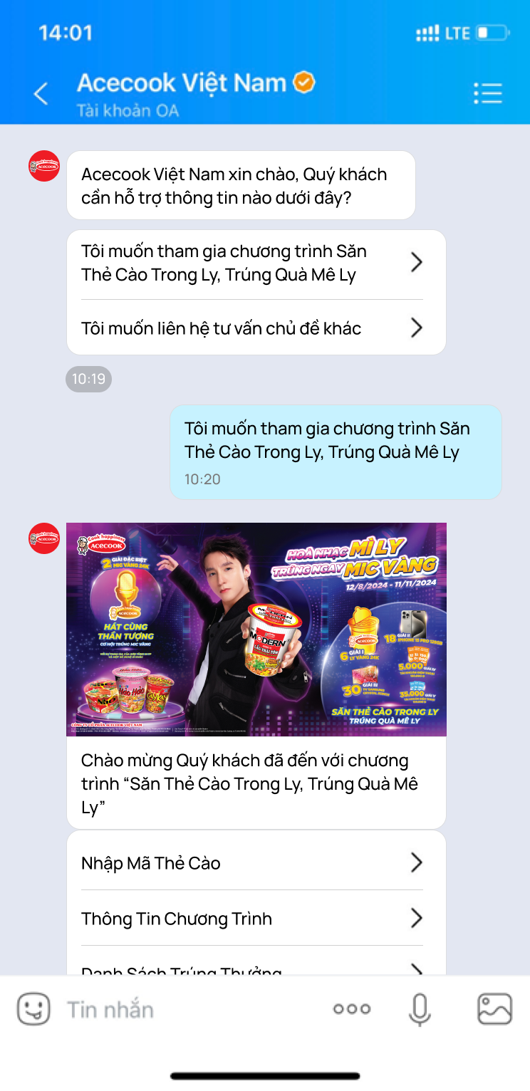 d. Trường hợp khách hàng đã tham gia chương trình khuyến mại của Công ty Cổ phần Acecook Việt Nam trước đó thông qua Zalo OA “Acecook Việt Nam” hoặc khách hàng vừa hoàn tất việc điền thông tin để hệ thống ghi nhận thông tin tham gia chương trình khuyến mại thì khách hàng sẽ nhận được hướng dẫn nhập mã thẻ cào: