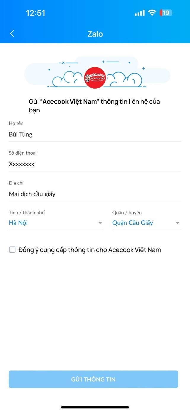 c. Trường hợp tài khoản Zalo của khách hàng chưa tham gia chương trình khuyến mại của Công ty Cổ phần Acecook Việt Nam trước đó thông qua Zalo OA “Acecook Việt Nam”, khách hàng sẽ nhận được tin nhắn qua Zalo OA nội dung “Quý khách vui lòng click vào banner trên, điền đầy đủ và chính xác thông tin cá nhân. Số điện thoại Quý khách cung cấp sẽ là căn cứ trao thưởng. Vui lòng kiểm tra kĩ thông tin tham gia chương trình để đảm bảo tính chính xác.”, khách hàng nhấn vào banner tin nhắn để điền thông tin (thông tin bao gồm Họ tên, Số điện thoại, Địa chỉ và chọn Tỉnh / thành phố; Quận / huyện). Khách hàng chọn “Đồng ý cung cấp thông tin cho Acecook Việt Nam”, khách hàng chọn “GỬI THÔNG TIN” để hệ thống ghi nhận thông tin tham gia chương trình khuyến mại của khách hàng. Khách hàng cần kiểm tra thông tin số điện thoại đã cung cấp, số điện thoại này phải liên kết với Zalo để nhận được tin nhắn từ chương trình.