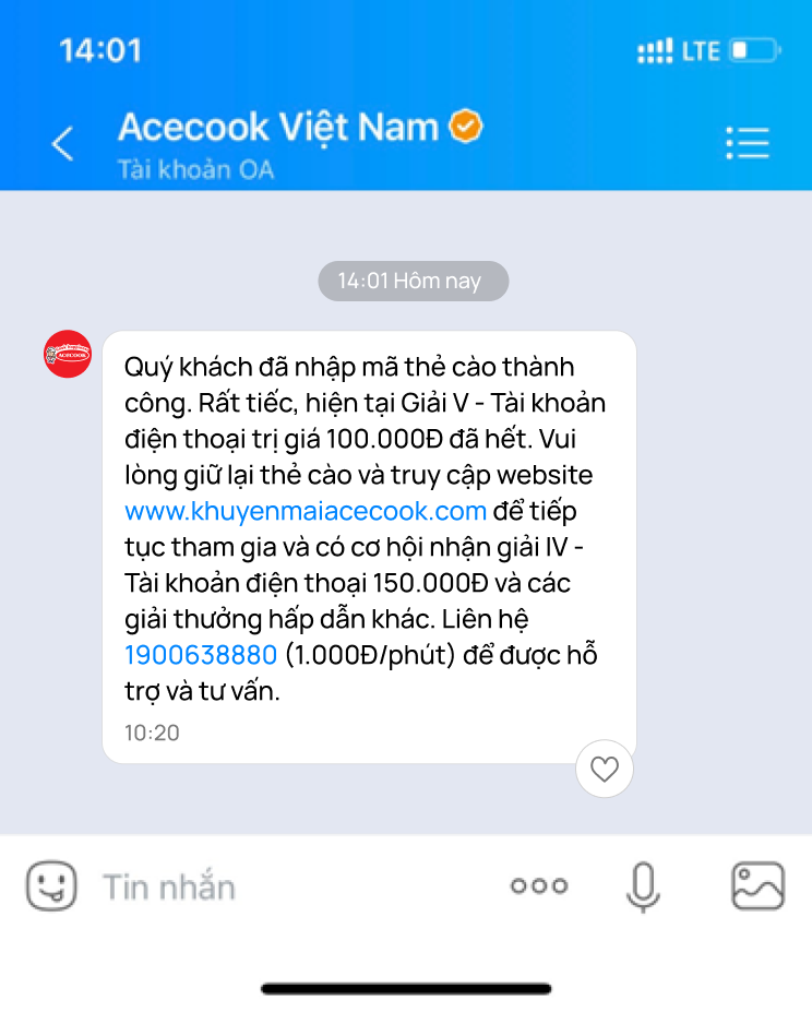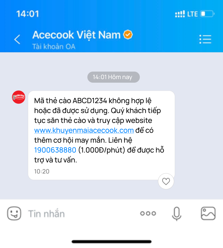 - Trường hợp mã thẻ cào không hợp lệ (mã không thuộc Danh Sách Mã Thẻ Cào) hoặc đã được sử dụng: khách hàng sẽ nhận được thông báo từ Zalo OA “Acecook Việt Nam” ngay lập tức với nội dung: “Mã thẻ cào ABCD1234 không hợp lệ hoặc đã được sử dụng. Quý khách tiếp tục săn thẻ cào và truy cập website www.khuyenmaiacecook.com để có thêm cơ hội may mắn. Liên hệ 1900638880 (1.000Đ/phút) để được hỗ trợ và tư vấn.”