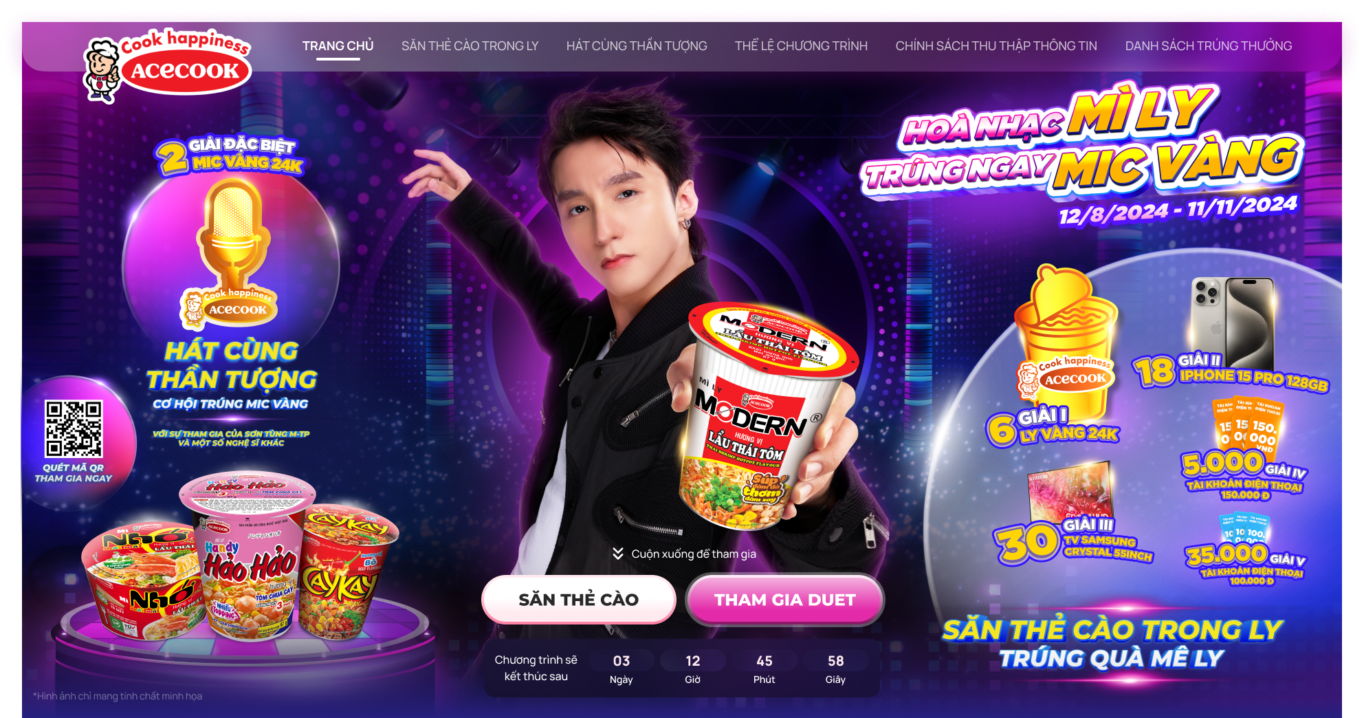 Công ty Cổ phần Acecook Việt Nam thông báo công khai chi tiết nội dung của Thể lệ chương trình khuyến mại trên website www.KhuyenmaiAcecook.com và tại các đại lý, nhà phân phối hàng hóa khuyến mại trên toàn quốc.