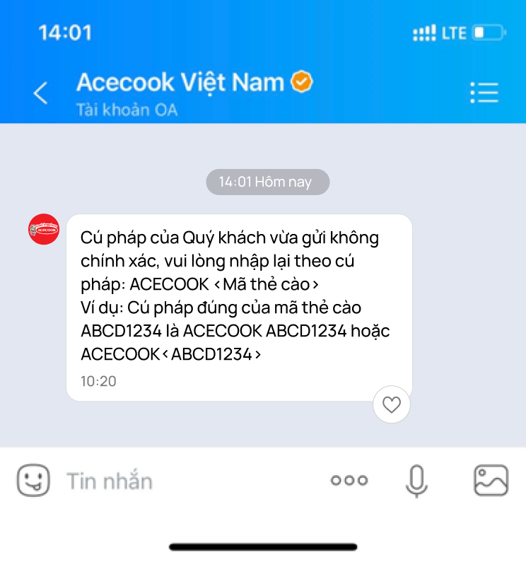 “Cú pháp của Quý khách vừa gửi không chính xác, vui lòng nhập lại theo cú pháp: ACECOOK <Mã thẻ cào>