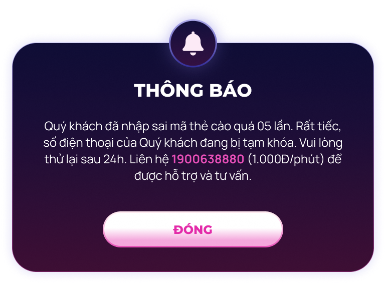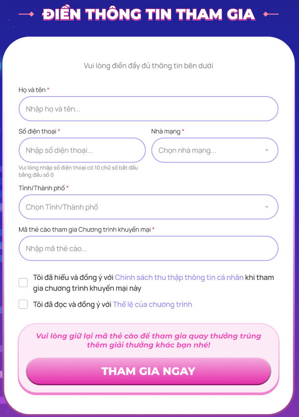 Khách hàng chỉ được tham gia xác định trúng thưởng khi thực hiện thao tác nhập mã thẻ cào theo hướng dẫn nêu trên trong Thời gian khuyến mại quy định tại Mục 3 Thể lệ (từ 00:00 ngày 12/08/2024 đến 23:59 ngày 11/11/2024). Trước và sau thời gian nói trên, tất cả những mã thẻ cào và việc nhập mã thẻ cào theo hướng dẫn sẽ không có giá trị sử dụng.