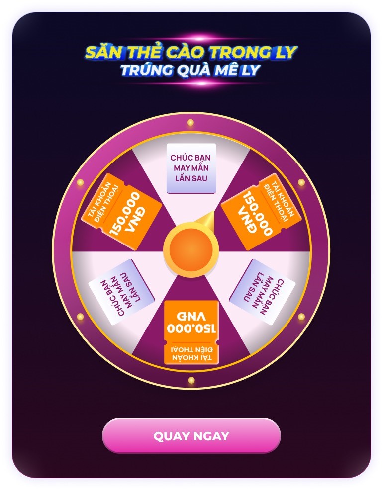 - Khách hàng có mã thẻ cào thuộc 35.000 mã thẻ cào đầu tiên tham gia Chương Trình hợp lệ sẽ chắc chắn trúng Giải V. Khách hàng có mã thẻ cào không thuộc nhóm 35.000 mã thẻ cào đầu tiên tham gia Chương Trình hợp lệ sẽ được tham gia vòng quay trên Website Chương Trình để có cơ hội trúng giải IV.