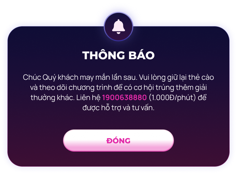 - Thông tin lưu ý khách hàng về việc giữ thẻ cào đề phòng khi chưa nhận giải thưởng “Vui lòng giữ lại thẻ cào để nhận thưởng. Thẻ cào hợp lệ nhận thưởng phải còn nguyên vẹn, phần cào nội dung không bị mất số và phần mã kiểm soát không bị trầy xước.”