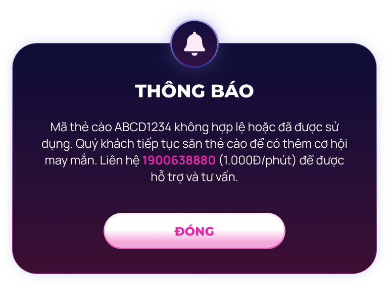 - Trường hợp mã thẻ cào hợp lệ (mã thuộc Danh Sách Mã Thẻ Cào) và thuộc 35.000 mã thẻ cào đầu tiên tham gia Chương Trình hợp lệ: