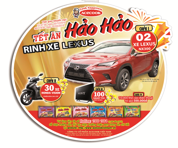 Để đáp lại sự đồng hành, yêu thương của Người tiêu dùng Việt Nam dành cho thương hiệu Hảo Hảo trong suốt thời gian qua, Hảo Hảo chính thức khởi động Chương trình khuyến mại dành cho Người tiêu dùng với tên gọi “ TẾT ĂN HẢO HẢO, RINH XE LEXUS” từ ngày 03 tháng 12 năm 21018 trên toàn quốc.